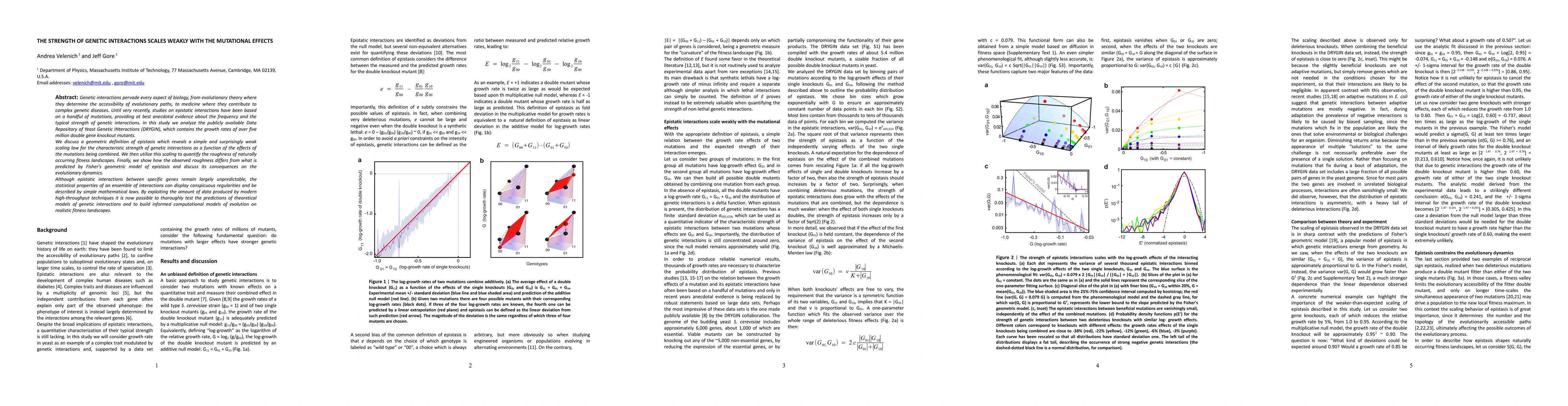 This study analyzes the DRYGIN database of yeast gene interactions, revealing a weak scaling law for genetic interaction strength based on individual mutation effects. The findings suggest that while specific gene interactions are unpredictable, statistical properties of many interactions follow simple mathematical patterns, aiding in modeling evolutionary dynamics and fitness landscapes.