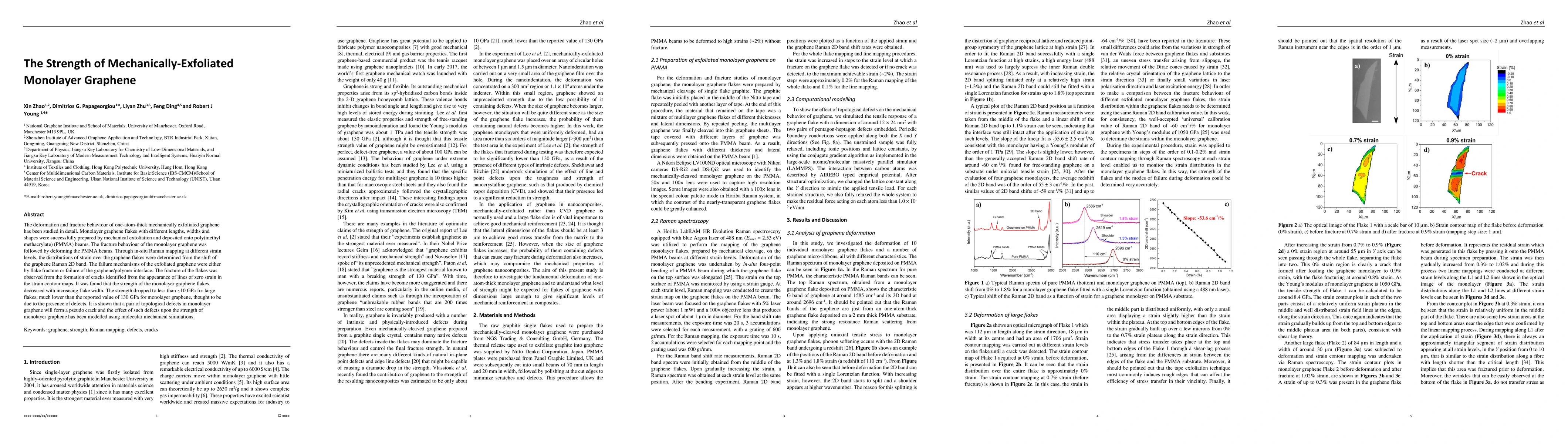The deformation and fracture behaviour of one-atom-thick mechanically exfoliated graphene has been studied in detail. Monolayer graphene flakes with different lengths, widths and shapes were successfully prepared by mechanical exfoliation and deposited onto poly(methyl methacrylate) (PMMA) beams. The fracture behaviour of the monolayer graphene was followed by deforming the PMMA beams. Through in-situ Raman mapping at different strain levels, the distributions of strain over the graphene flakes were determined from the shift of the graphene Raman 2D band. The failure mechanisms of the exfoliated graphene were either by flake fracture or failure of the graphene/polymer interface. The fracture of the flakes was observed from the formation of cracks identified from the appearance of lines of zero strain in the strain contour maps. It was found that the strength of the monolayer graphene flakes decreased with increasing flake width. The strength dropped to less than 10 GPa for large flakes, much lower than the reported value of 130 GPa for monolayer graphene, thought to be due to the presence of defects. It is shown that a pair of topological defects in monolayer graphene will form a pseudo crack and the effect of such defects upon the strength of monolayer graphene has been modelled using molecular mechanical simulations.