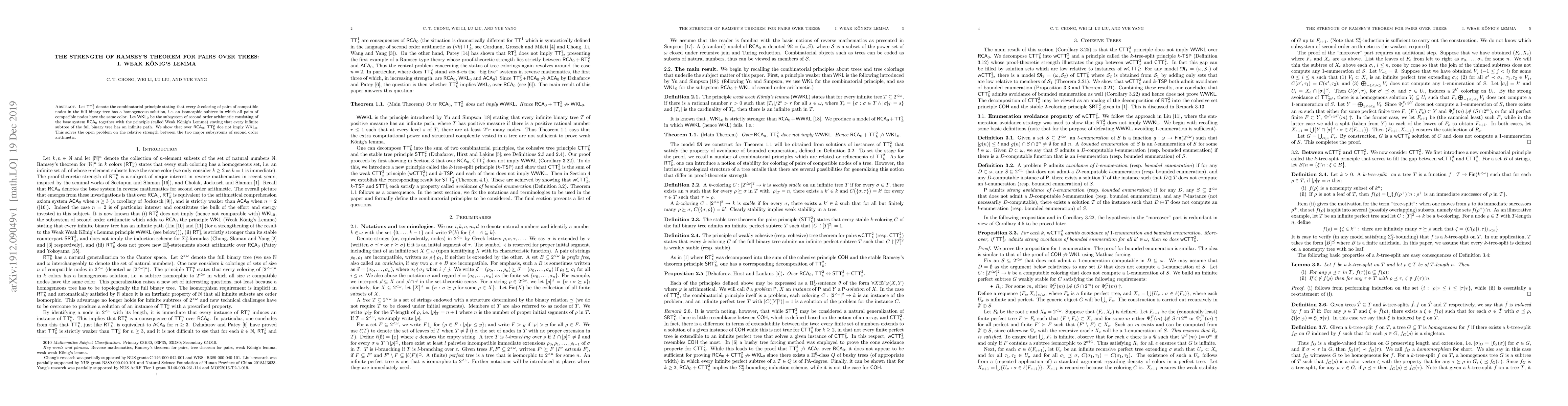 Let $\mathsf{TT}^2_k$ denote the combinatorial principle stating that every $k$-coloring of pairs of compatible nodes in the full binary tree has a homogeneous solution, i.e. an isomorphic subtree in which all pairs of compatible nodes have the same color. Let $\mathsf{WKL}_0$ be the subsystem of second order arithmetic consisting of the base system $\mathsf{RCA}_0$ together with the principle (called Weak K\"onig's Lemma) stating that every infinite subtree of the full binary tree has an infinite path. We show that over $\mathsf{RCA}_0$, $\mathsf{TT}^2_k$ doe not imply $\mathsf{WKL}_0$. This solves the open problem on the relative strength between the two major subsystems of second order arithmetic.