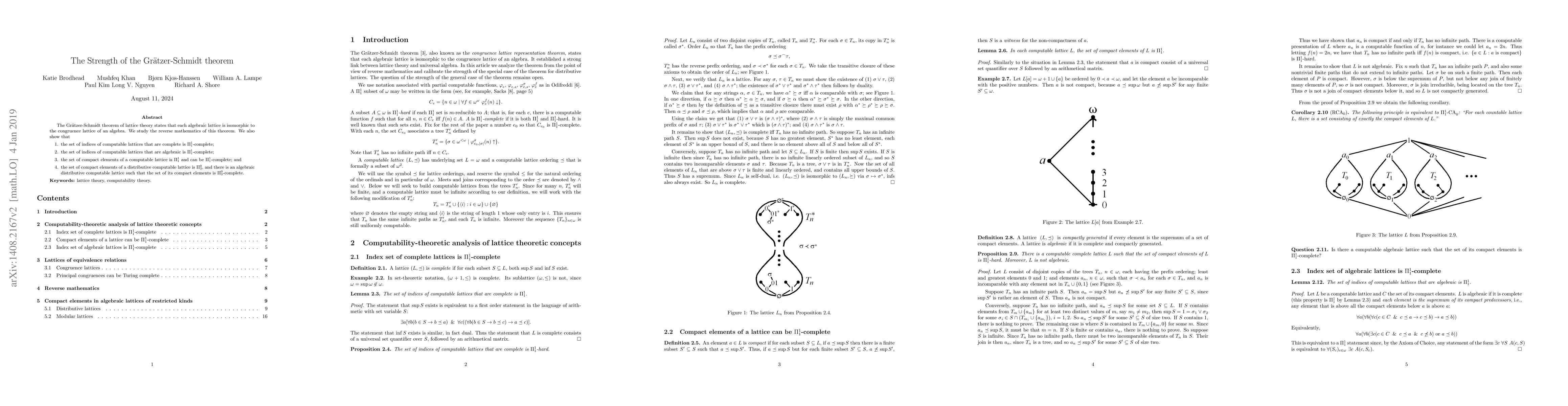 The Gr\"atzer-Schmidt theorem of lattice theory states that each algebraic lattice is isomorphic to the congruence lattice of an algebra. We study the reverse mathematics of this theorem. We also show that the set of indices of computable lattices that are complete is $\Pi^1_1$-complete; the set of indices of computable lattices that are algebraic is $\Pi^1_1$-complete; the set of compact elements of a computable lattice is $\Pi^{1}_{1}$ and can be $\Pi^1_1$-complete; and the set of compact elements of a distributive computable lattice is $\Pi^{0}_{3}$, and there is an algebraic distributive computable lattice such that the set of its compact elements is $\Pi^0_3$-complete.