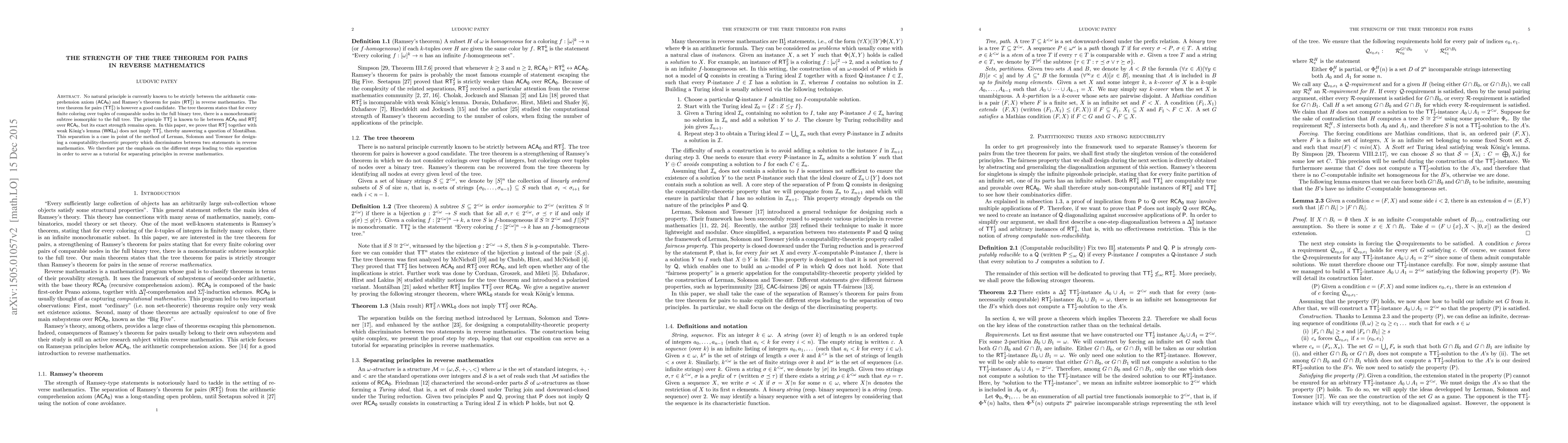 No natural principle is currently known to be strictly between the arithmetic comprehension axiom (ACA) and Ramsey's theorem for pairs (RT^2_2) in reverse mathematics. The tree theorem for pairs (TT^2_2) is however a good candidate. The tree theorem states that for every finite coloring over tuples of comparable nodes in the full binary tree, there is a monochromatic subtree isomorphic to the full tree. The principle TT^2_2 is known to lie between ACA and RT^2_2 over RCA, but its exact strength remains open. In this paper, we prove that RT^2_2 together with weak K\"onig's lemma (WKL) does not imply TT^2_2, thereby answering a question of Montalban. This separation is a case in point of the method of Lerman, Solomon and Towsner for designing a computability-theoretic property which discriminates between two statements in reverse mathematics. We therefore put the emphasis on the different steps leading to this separation in order to serve as a tutorial for separating principles in reverse mathematics.