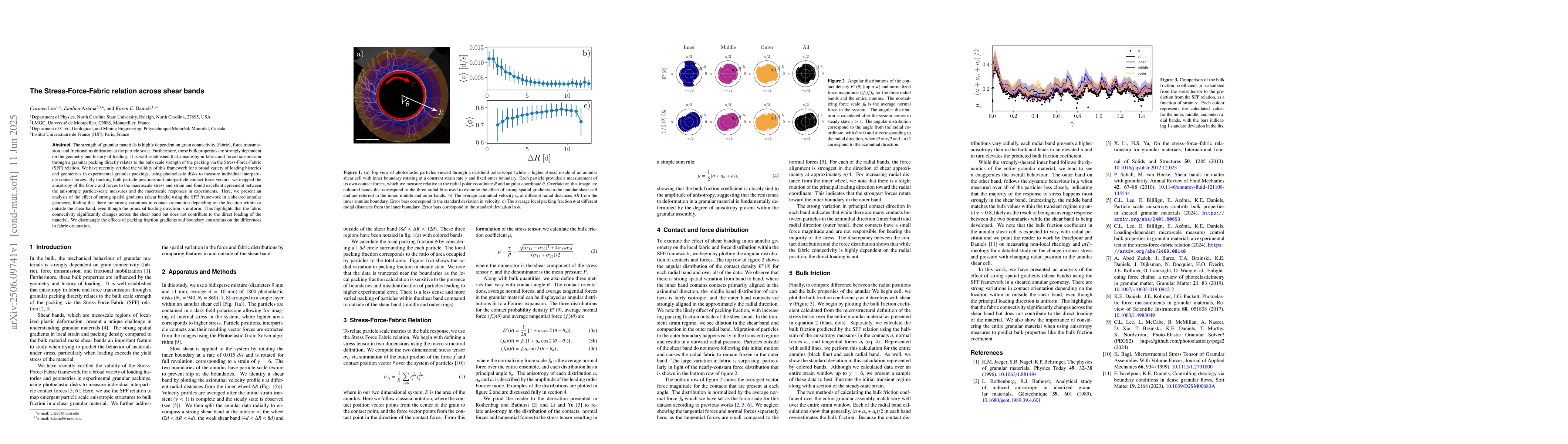 The strength of granular materials is highly dependent on grain connectivity (fabric), force transmission, and frictional mobilization at the particle scale. Furthermore, these bulk properties are strongly dependent on the geometry and history of loading. It is well established that anisotropy in fabric and force transmission through a granular packing directly relates to the bulk scale strength of the packing via the Stress-Force-Fabric (SFF) relation. We have recently verified the validity of this framework for a broad variety of loading histories and geometries in experimental granular packings, using photoelastic disks to measure individual interparticle contact forces. By tracking both particle positions and interparticle contact force vectors, we mapped the anisotropy of the fabric and forces to the macroscale stress and strain and found excellent agreement between the anisotropic particle-scale measures and the macroscale responses in experiments. Here, we present an analysis of the effect of strong spatial gradients (shear bands) using the SFF framework in a sheared annular geometry, finding that there are strong variations in contact orientation depending on the location within or outside the shear band, even though the principal loading direction is uniform. This highlights that the fabric connectivity significantly changes across the shear band but does not contribute to the direct loading of the material. We disentangle the effects of packing fraction gradients and boundary constraints on the differences in fabric orientation.
