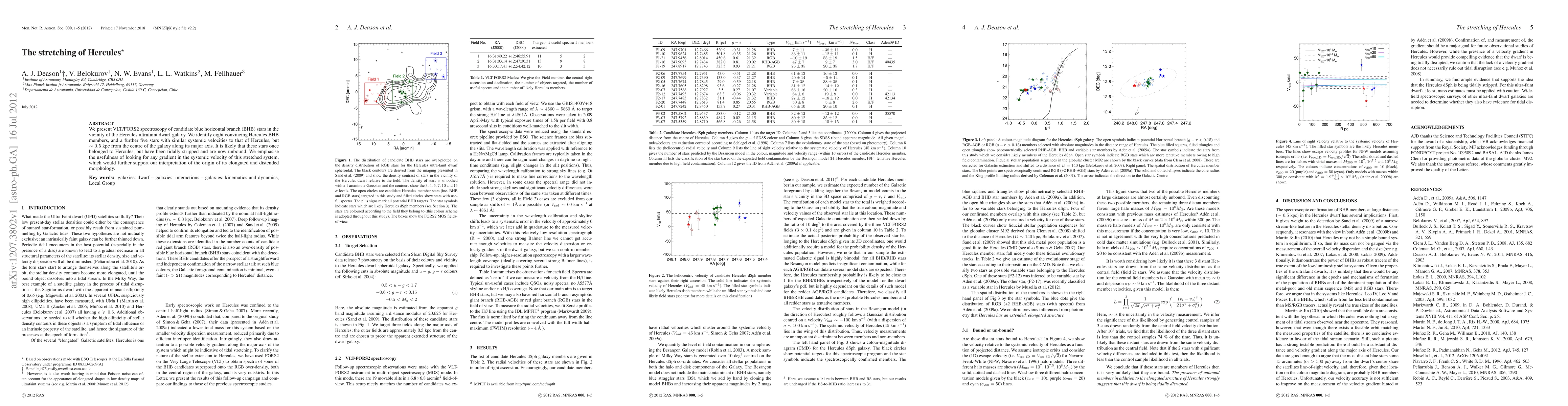 We present VLT/FORS2 spectroscopy of candidate blue horizontal branch (BHB) stars in the vicinity of the Hercules ultrafaint dwarf galaxy. We identify eight convincing Hercules BHB members, and a further five stars with similar systemic velocities to that of Hercules, but ~ 0.5 kpc from the centre of the galaxy along its major axis. It is likely that these stars once belonged to Hercules, but have been tidally stripped and are now unbound. We emphasise the usefulness of looking for any gradient in the systemic velocity of this stretched system, which would further support our interpretation of the origin of its elongated and distended morphology.