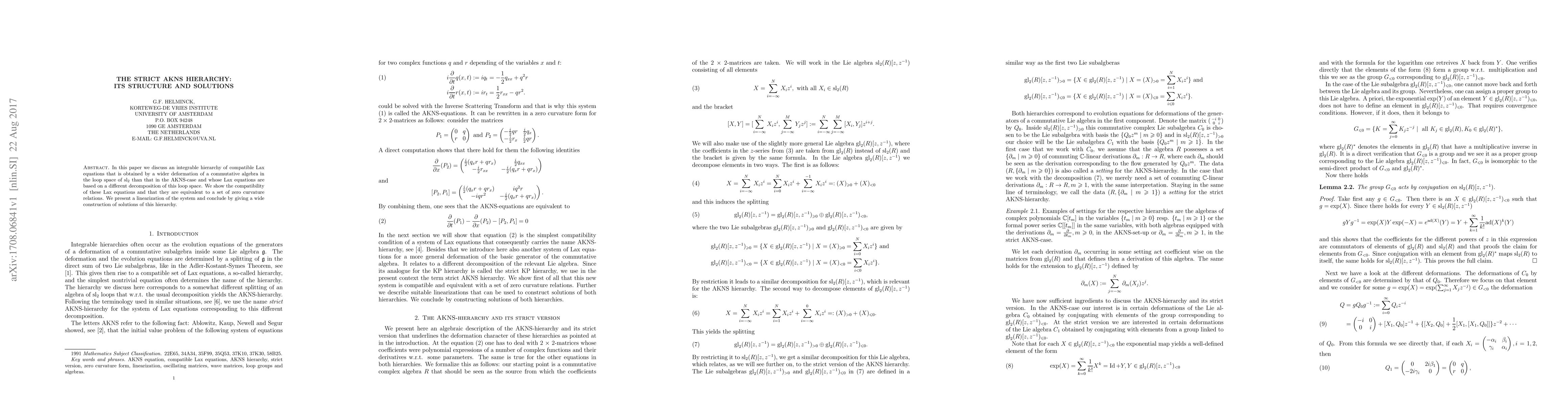 In this paper we discuss an integrable hierarchy of compatible Lax equations that is obtained by a wider deformation of a commutative algebra in the loop space of ${\rm sl}_{2}$ than that in the AKNS-case and whose Lax equations are based on a different decomposition of this loop space. We show the compatibility of these Lax equations and that they are equivalent to a set of zero curvature relations. We present a linearization of the system and conclude by giving a wide construction of solutions of this hierarchy.
