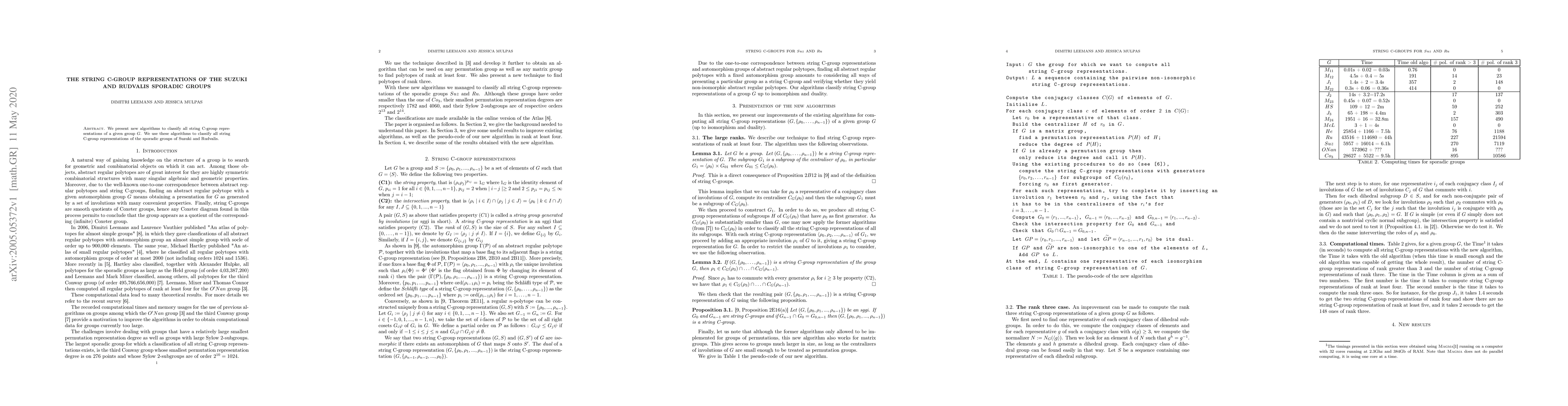 Summary: The paper introduces new algorithms to classify string C-group representations for specific groups, applying these methods to thoroughly classify such representations for the sporadic groups of Suzuki and Rudvalis.