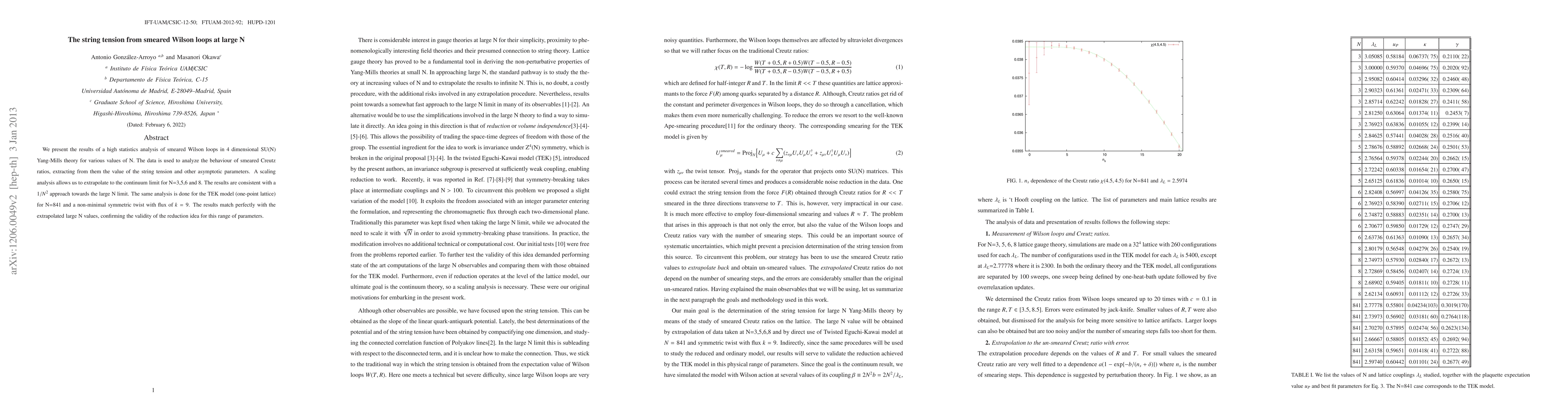 We present the results of a high statistics analysis of smeared Wilson loops in 4 dimensional SU(N) Yang-Mills theory for various values of N. The data is used to analyze the behaviour of smeared Creutz ratios, extracting from them the value of the string tension and other asymptotic parameters. A scaling analysis allows us to extrapolate to the continuum limit for N=3,5,6 and 8. The results are consistent with a $1/N^2$ approach towards the large N limit. The same analysis is done for the TEK model (one-point lattice) for N=841 and a non-minimal symmetric twist with flux of $k=9$. The results match perfectly with the extrapolated large N values, confirming the validity of the reduction idea for this range of parameters.