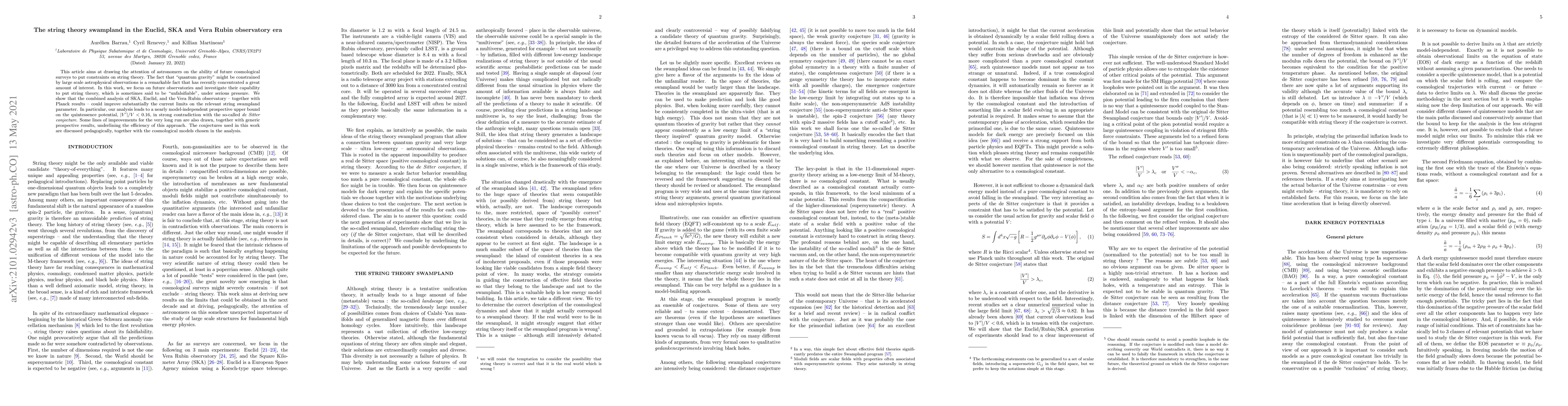 This article aims at drawing the attention of astronomers on the ability of future cosmological surveys to put constraints on string theory. The fact that "quantum gravity" might be constrained by large scale astrophysical observations is a remarkable fact that has recently concentrated a great amount of interest. In this work, we focus on future observatories and investigate their capability to put string theory, which is sometimes said to be "unfalsifiable", under serious pressure. We show that the combined analysis of SKA, Euclid, and the Vera Rubin observatory - together with Planck results - could improve substantially the current limits on the relevant string swampland parameter. In particular, our analysis leads to a nearly model-independent prospective upper bound on the quintessence potential, |V'|/V<0.16, in strong contradiction with the so-called de Sitter conjecture. Some lines of improvements for the very long run are also drawn, together with generic prospective results, underlining the efficiency of this approach. The conjectures used in this work are discussed pedagogically, together with the cosmological models chosen in the analysis.