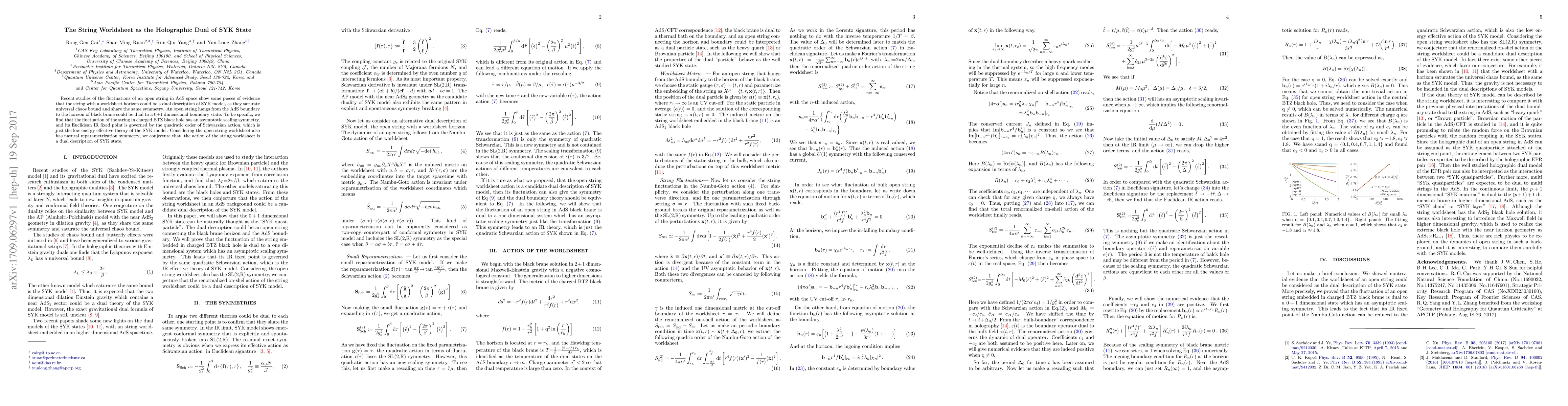 This paper proposes that the worldsheet of an open string in AdS space, particularly in a charged BTZ black hole, serves as a holographic dual to the SYK model. The string's fluctuations exhibit an asymptotic scaling symmetry and are governed by the Schwarzian action, mirroring the SYK model's low-energy effective theory.