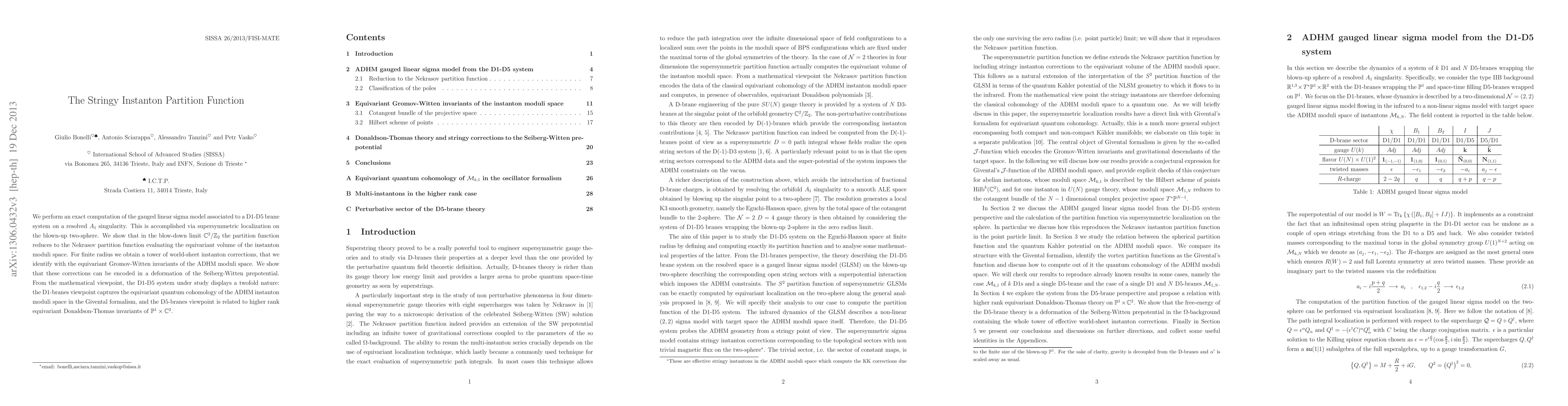 We perform an exact computation of the gauged linear sigma model associated to a D1-D5 brane system on a resolved A_1 singularity. This is accomplished via supersymmetric localization on the blown-up two-sphere. We show that in the blow-down limit C^2/Z_2 the partition function reduces to the Nekrasov partition function evaluating the equivariant volume of the instanton moduli space. For finite radius we obtain a tower of world-sheet instanton corrections, that we identify with the equivariant Gromov-Witten invariants of the ADHM moduli space. We show that these corrections can be encoded in a deformation of the Seiberg-Witten prepotential. From the mathematical viewpoint, the D1-D5 system under study displays a twofold nature: the D1-branes viewpoint captures the equivariant quantum cohomology of the ADHM instanton moduli space in the Givental formalism, and the D5-branes viewpoint is related to higher rank equivariant Donaldson-Thomas invariants of P^1 x C^2.