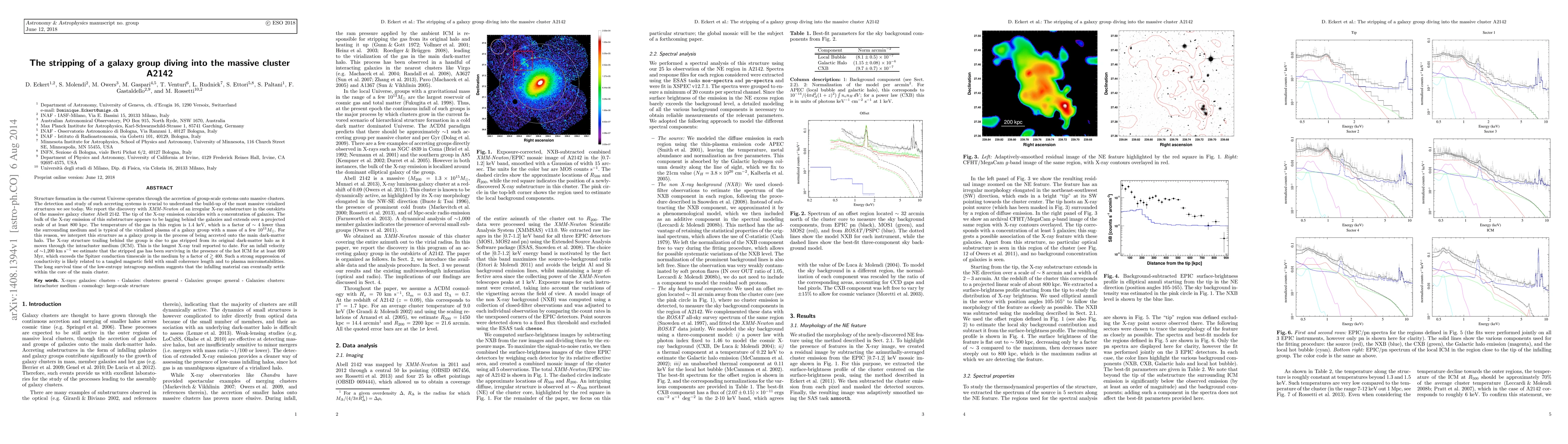 Structure formation in the current Universe operates through the accretion of group-scale systems onto massive clusters. The detection and study of such accreting systems is crucial to understand the build-up of the most massive virialized structures we see today. We report the discovery with XMM-Newton of an irregular X-ray substructure in the outskirts of the massive galaxy cluster Abell 2142. The tip of the X-ray emission coincides with a concentration of galaxies. The bulk of the X-ray emission of this substructure appears to be lagging behind the galaxies and extends over a projected scale of at least 800 kpc. The temperature of the gas in this region is 1.4 keV, which is a factor of ~4 lower than the surrounding medium and is typical of the virialized plasma of a galaxy group with a mass of a few 10^13M_sun. For this reason, we interpret this structure as a galaxy group in the process of being accreted onto the main dark-matter halo. The X-ray structure trailing behind the group is due to gas stripped from its original dark-matter halo as it moves through the intracluster medium (ICM). This is the longest X-ray trail reported to date. For an infall velocity of ~1,200 km s-1 we estimate that the stripped gas has been surviving in the presence of the hot ICM for at least 600 Myr, which exceeds the Spitzer conduction timescale in the medium by a factor of >~400. Such a strong suppression of conductivity is likely related to a tangled magnetic field with small coherence length and to plasma microinstabilities. The long survival time of the low-entropy intragroup medium suggests that the infalling material can eventually settle within the core of the main cluster.