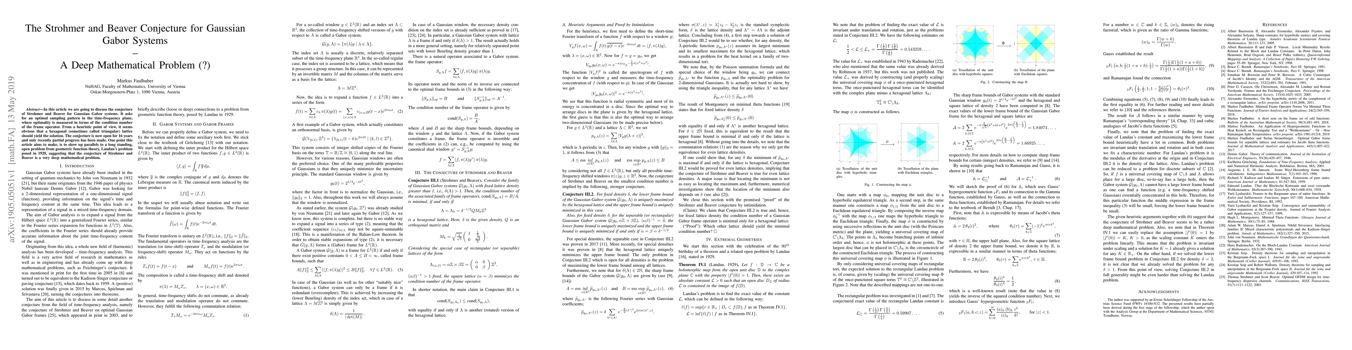 In this article we are going to discuss the conjecture of Strohmer and Beaver for Gaussian Gabor systems. It asks for an optimal sampling pattern in the time-frequency plane, where optimality is measured in terms of the condition number of the frame operator. From a heuristic point of view, it seems obvious that a hexagonal (sometimes called triangular) lattice should yield the solution. The conjecture is now open for 16 years and only recently partial progress has been made. One point this article aims to make, is to show up parallels to a long standing, open problem from geometric function theory, Landau's problem posed in 1929, suggesting that the conjecture of Strohmer and Beaver is a very deep mathematical problem.