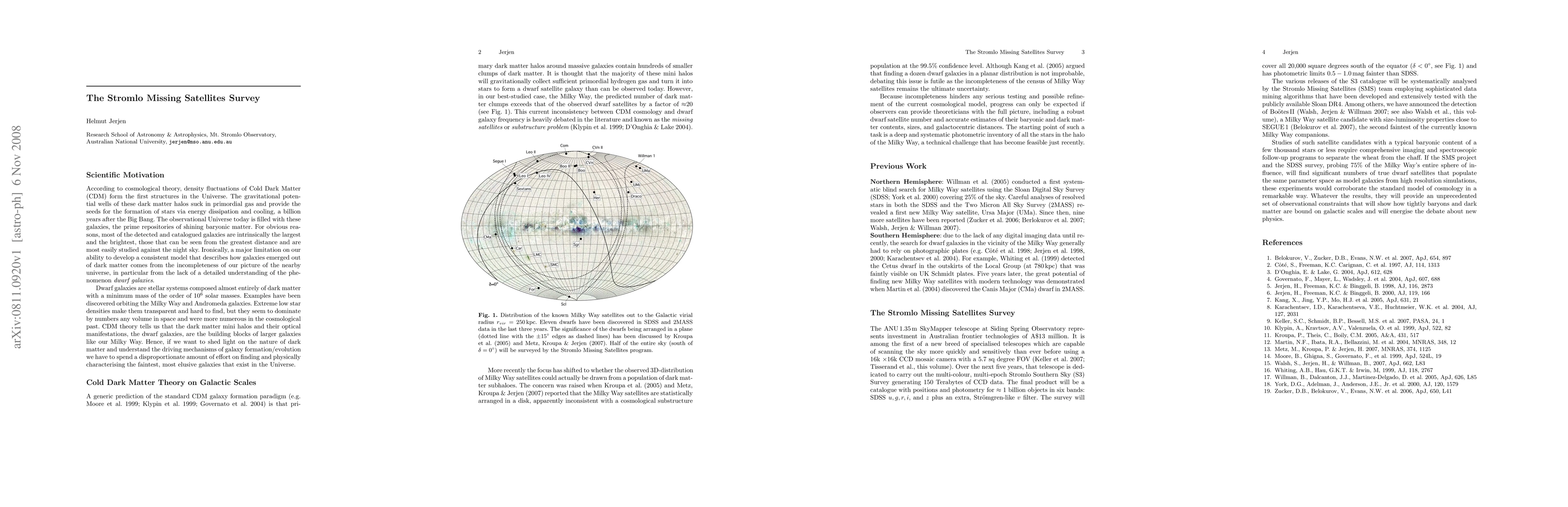 The Stromlo Missing Satellites (SMS) program is a critical endeavor to investigate whether cold dark matter cosmology is flawed in its ability to describe the matter distribution on galaxy scales or proves itself once again as a powerful theory to make observational predictions. The project will deliver unprecedented results on Milky Way satellite numbers, their distribution and physical properties. It is the deepest, most extended survey for optically elusive dwarf satellite galaxies to date, covering the entire 20,000 sq deg of the Southern hemisphere. 150TB of CCD images will be analysed in six photometric bands, 0.5-1.0 mag fainter than SDSS produced by the ANU SkyMapper telescope over the next five years. (For more details see: http://msowww.anu.edu.au/~jerjen/SMS_Survey.html)