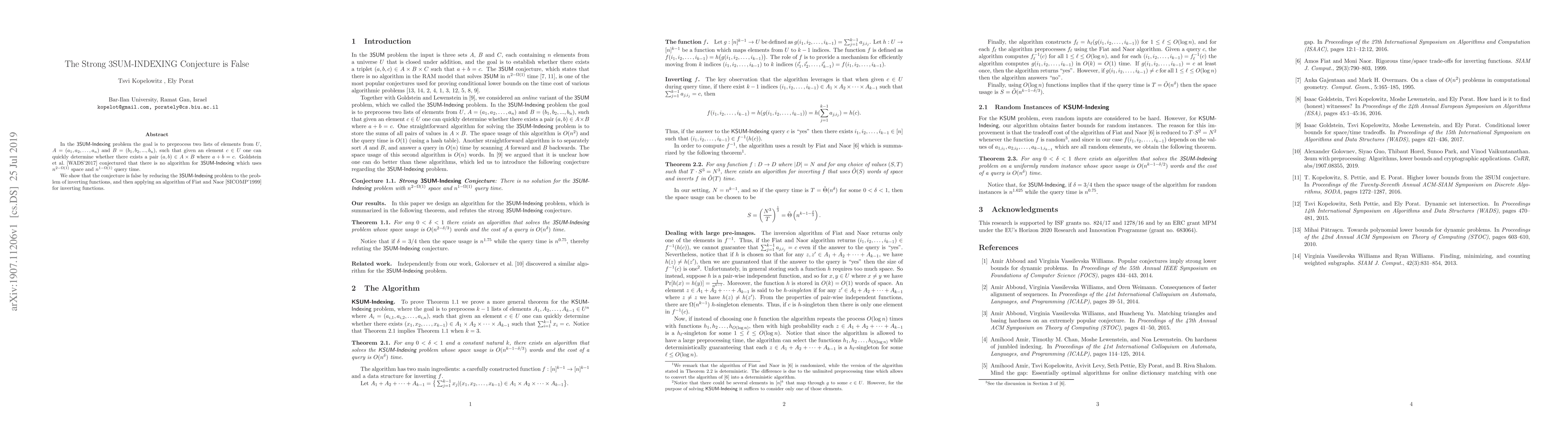 The Strong 3SUM-Indexing Conjecture, which posited that no algorithm could achieve $n^{2-\Omega(1)}$ space and $n^{1-\Omega(1)}$ query time for 3SUM-Indexing, is disproven. The authors demonstrate this by reducing the problem to inverting functions and utilizing an algorithm by Fiat and Naor.