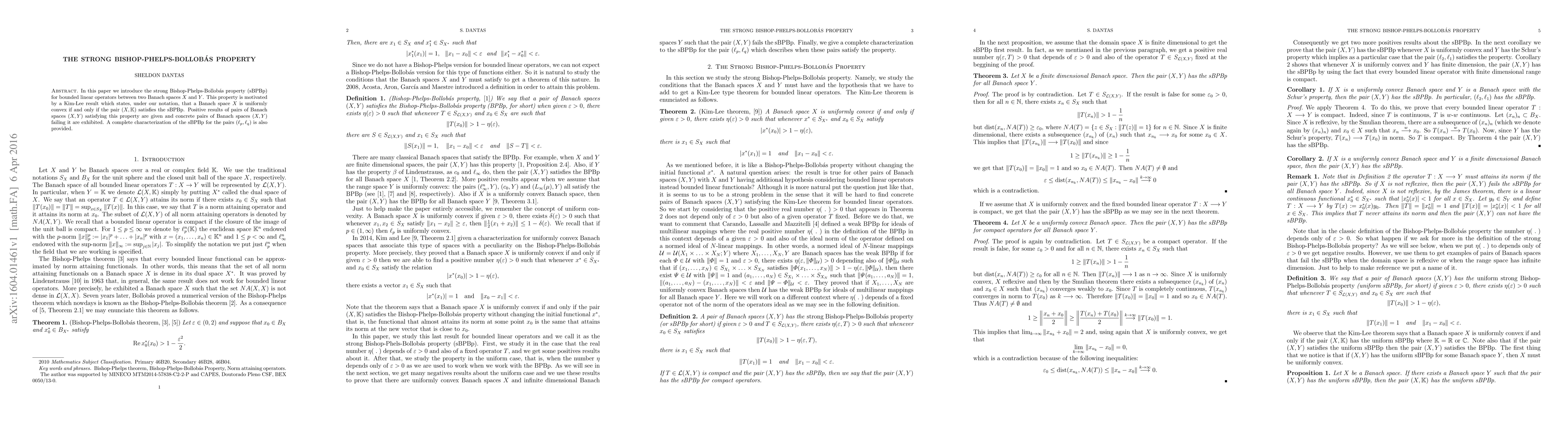 In this paper we introduce the strong Bishop-Phelps-Bollob\'as property (sBPBp) for bounded linear operators between two Banach spaces $X$ and $Y$. This property is motivated by a Kim-Lee result which states, under our notation, that a Banach space $X$ is uniformly convex if and only if the pair $(X,\mathbb{K})$ satisfies the sBPBp. Positive results of pairs of Banach spaces $(X,Y)$ satisfying this property are given and concrete pairs of Banach spaces $(X, Y)$ failing it are exhibited. A complete characterization of the sBPBp for the pairs $(\ell_p, \ell_q)$ is also provided.
