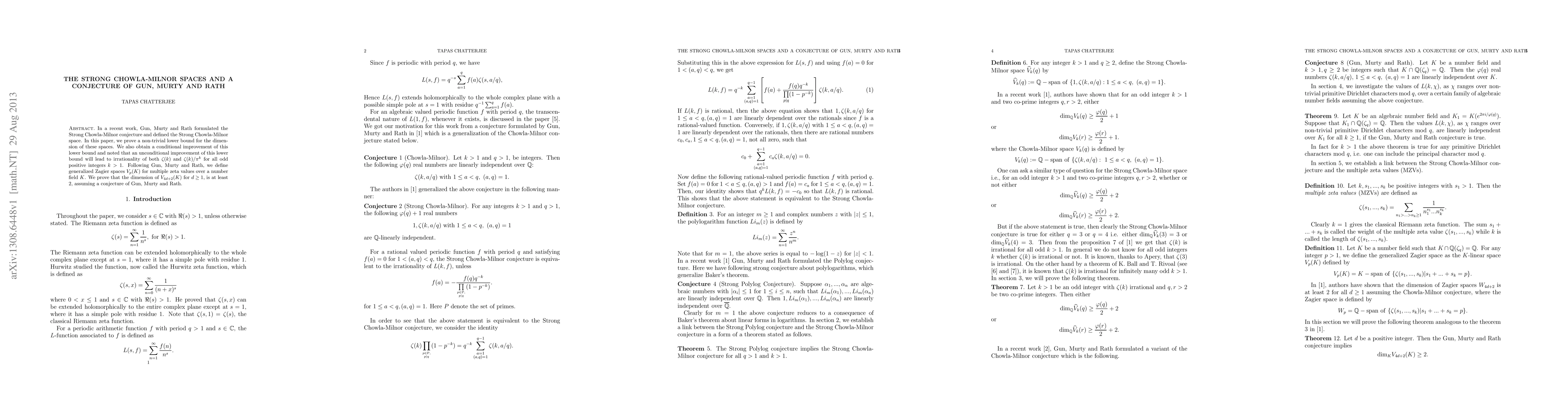 This paper proves a non-trivial lower bound for the dimension of Strong Chowla-Milnor spaces and a conditional improvement of this bound. An unconditional improvement would imply the irrationality of $\zeta(k)$ and $\zeta(k)/ \pi^k$ for odd integers $k>1$. It also establishes the dimension of generalized Zagier spaces $V_{4d+2}(K)$ as at least 2 for $d\geq 1$ under a conjecture by Gun, Murty, and Rath.