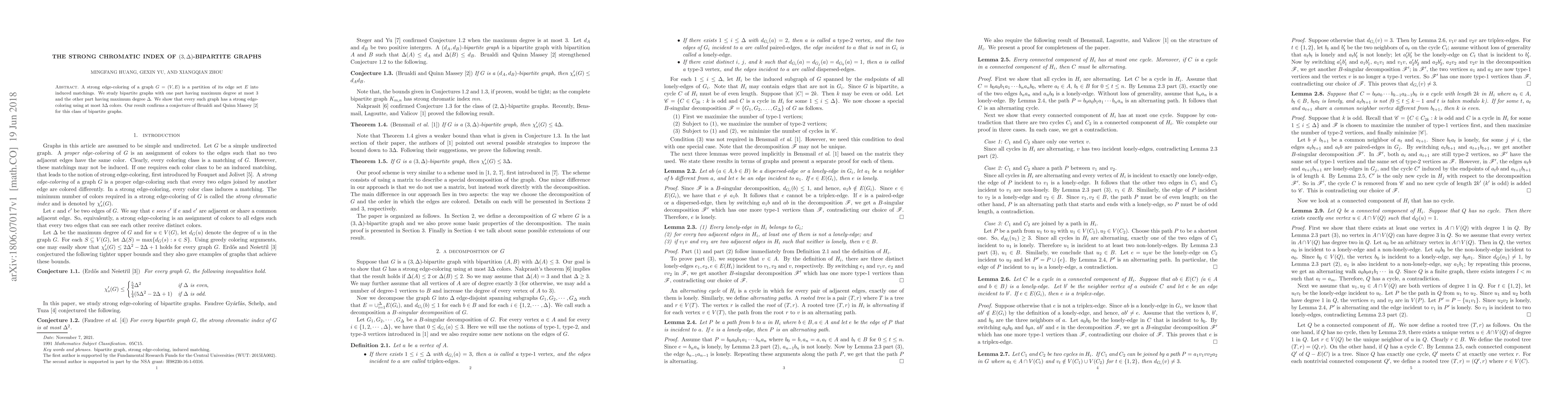 This paper demonstrates that $(3,\Delta)$-bipartite graphs, where one part has a maximum degree of 3 and the other part has a maximum degree of $\Delta$, can be strongly edge-colored using at most $3\Delta$ colors, confirming a conjecture by Brualdi and Quinn Massey.