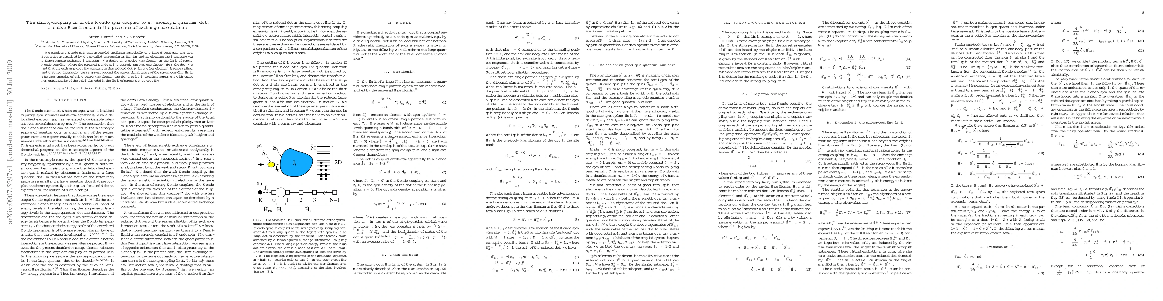 This paper derives an effective Hamiltonian for a Kondo spin strongly coupled to a mesoscopic quantum dot with ferromagnetic exchange interactions, revealing renormalized exchange coupling and new interaction terms in the strong-coupling limit, which aligns well with exact numerical results.