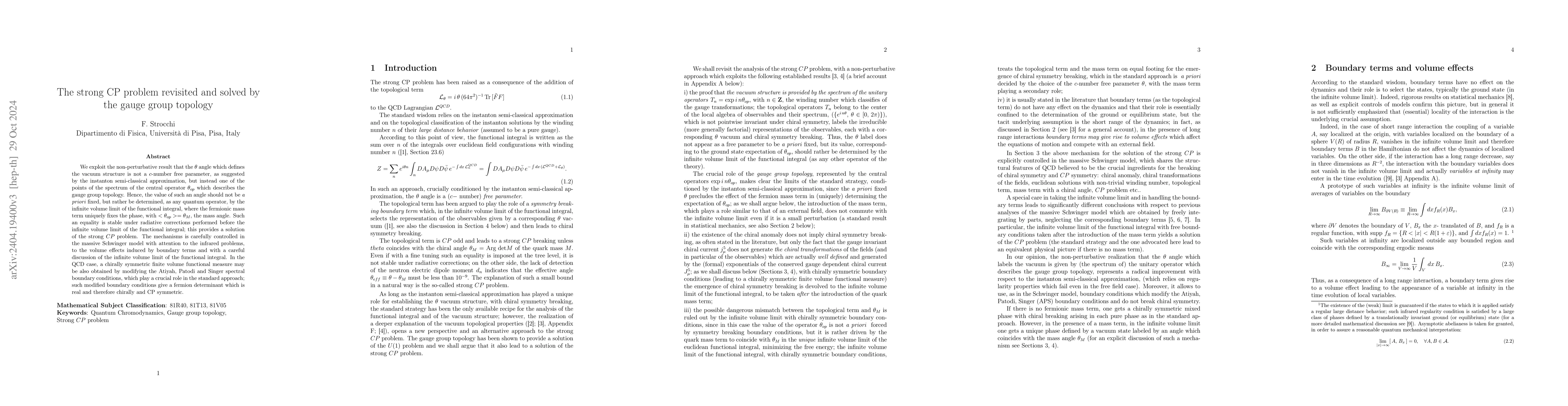 This paper addresses the strong CP problem by showing that the $\theta$ angle, traditionally considered a free parameter, is instead tied to the gauge group topology. The angle is determined by the infinite volume limit of the functional integral, where the fermionic mass term sets the phase, solving the strong CP problem.