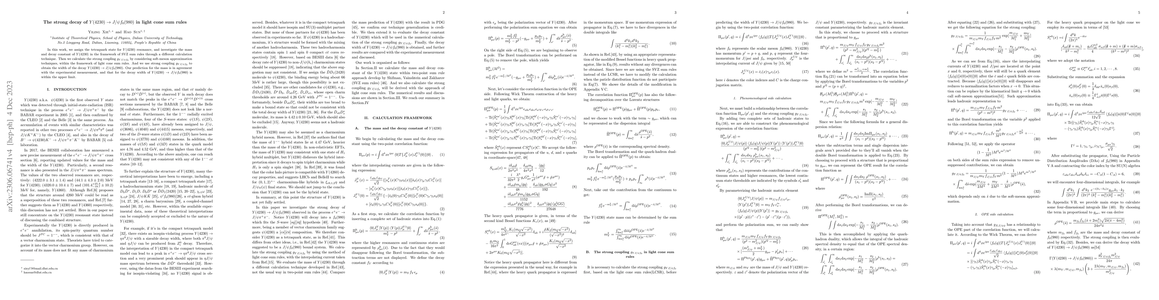 This paper assigns the tetraquark state to $Y(4230)$ and calculates its mass and decay constant using SVZ sum rules. It then determines the strong coupling $g_{Y J/\psi f_0}$ via light cone sum rules and soft-meson approximation, predicting the decay width of $Y(4230)\to J/\psi f_0(980)$, which aligns with experimental measurements.