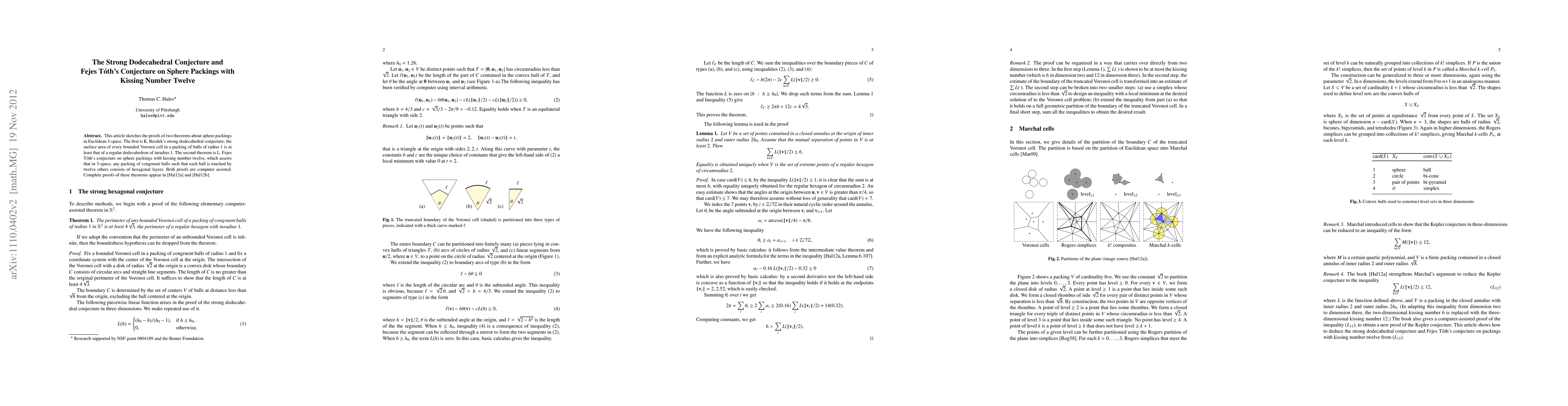 This article sketches the proofs of two theorems about sphere packings in Euclidean 3-space. The first is K. Bezdek's strong dodecahedral conjecture: the surface area of every bounded Voronoi cell in a packing of balls of radius 1 is at least that of a regular dodecahedron of inradius 1. The second theorem is L. Fejes Toth's contact conjecture, which asserts that in 3-space, any packing of congruent balls such that each ball is touched by twelve others consists of hexagonal layers. Both proofs are computer assisted. Complete proofs of these theorems appear in the author's book "Dense Sphere Packings" and a related preprint