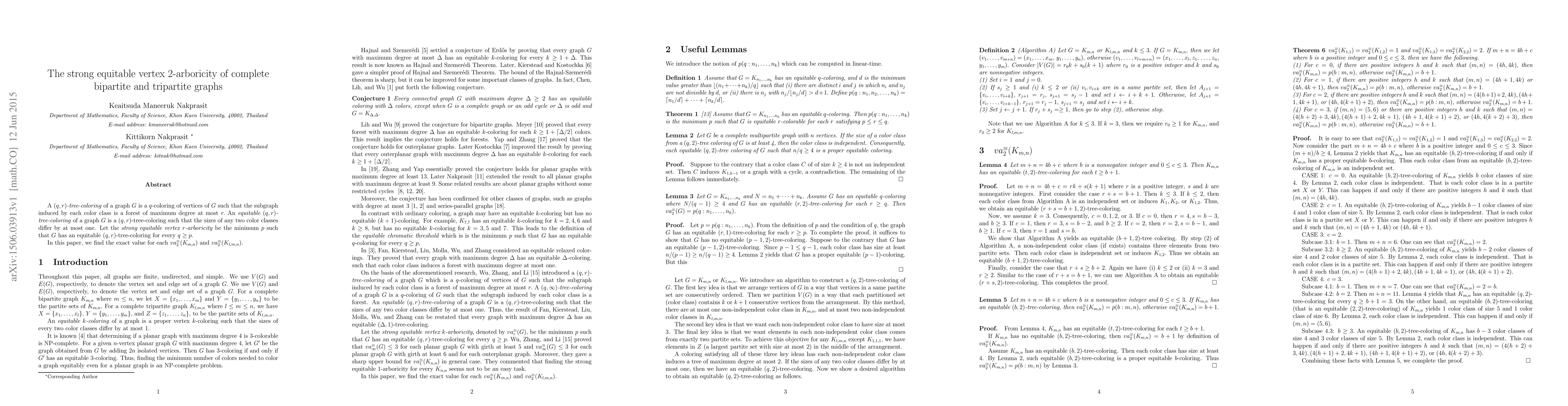 This paper determines the exact strong equitable vertex 2-arboricity for complete bipartite graphs $K_{m,n}$ and complete tripartite graphs $K_{l,m,n}$. It focuses on equitable $(q,r)$-tree-colorings where the sizes of any two color classes differ by at most one.