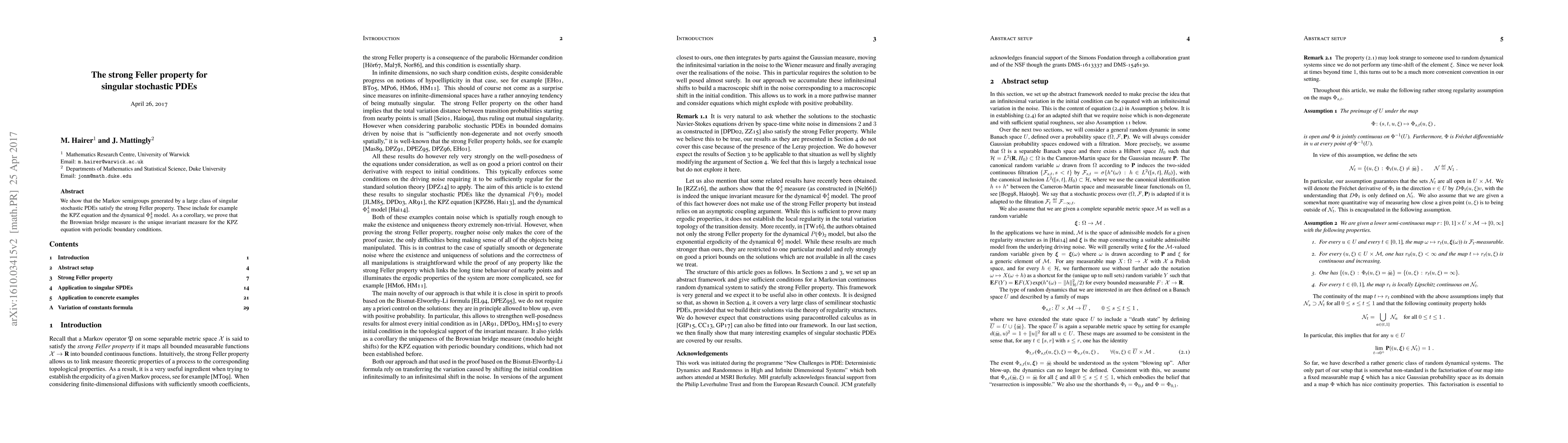 Summary: This paper demonstrates the strong Feller property for Markov semigroups derived from various singular stochastic PDEs, including the KPZ equation and the dynamical $\Phi^4_3$ model, and proves that the Brownian bridge measure is the unique invariant measure for the KPZ equation under periodic boundary conditions.
