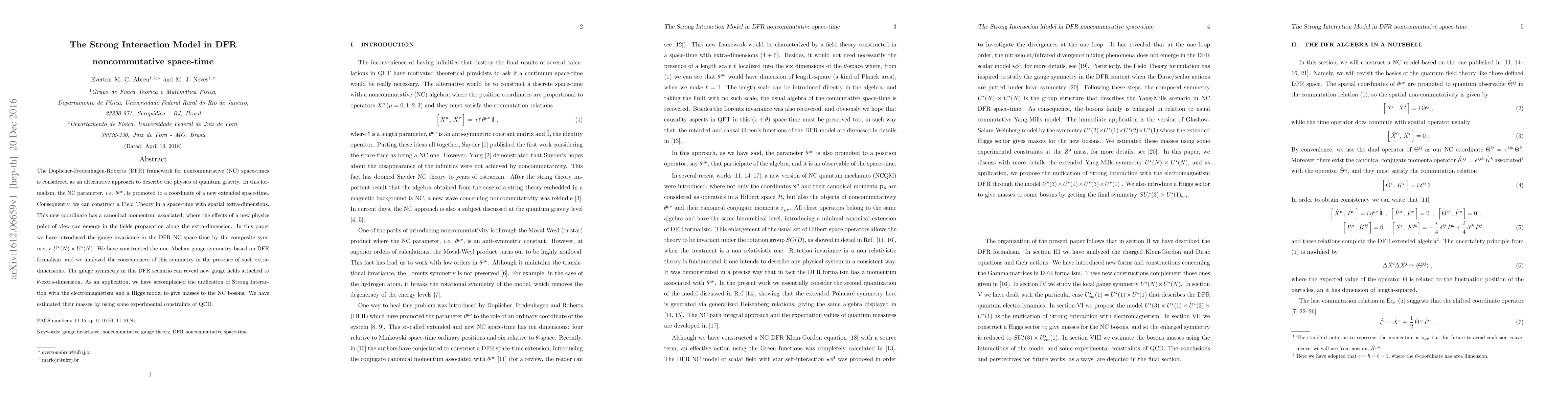 This paper explores the Doplicher-Fredenhagen-Roberts (DFR) framework for noncommutative space-time, introducing gauge invariance and constructing a non-Abelian gauge symmetry. It unifies Strong Interaction with electromagnetism and a Higgs model, estimating masses for noncommutative bosons using QCD constraints.