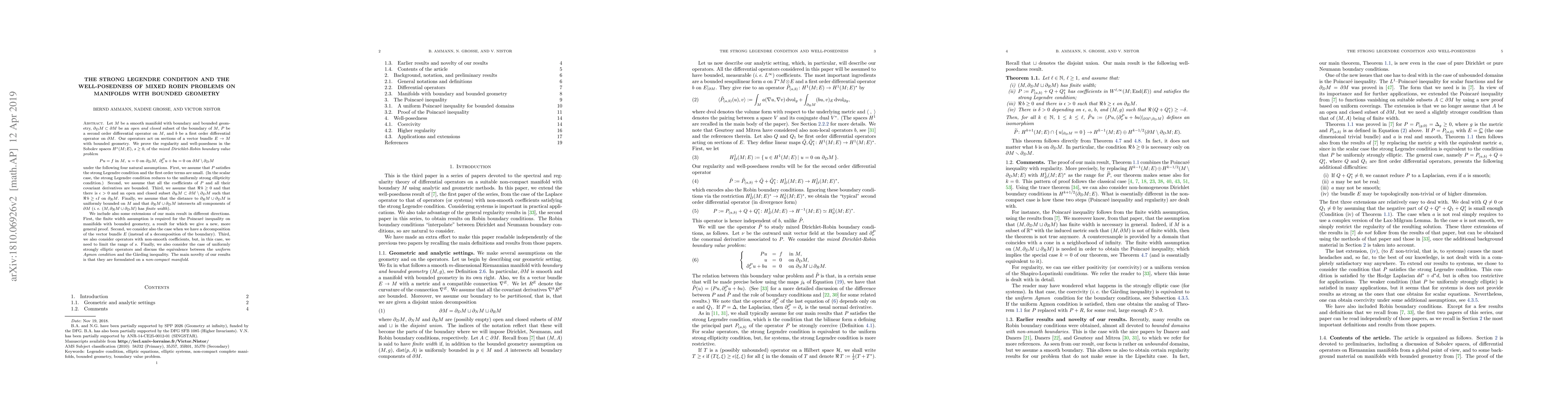 Let $M$ be a smooth manifold with boundary $\partial M$ and bounded geometry, $\partial_D M \subset \partial M$ be an open and closed subset, $P$ be a second order differential operator on $M$, and $b$ be a first order differential operator on $\partial M \smallsetminus \partial_D M$. We prove the regularity and well-posedness of the mixed Robin boundary value problem $$Pu = f \mbox{ in } M,\ u = 0 \mbox{ on } \partial_D M,\ \partial^P_\nu u + bu = 0 \mbox{ on } \partial M \setminus \partial_D M$$ under some natural assumptions. Our operators act on sections of a vector bundle $E \to M$ with bounded geometry. Our well-posedness result is in the Sobolev spaces $H^s(M; E)$, $s \geq 0$. The main novelty of our results is that they are formulated on a non-compact manifold. We include also some extensions of our main result in different directions. First, the finite width assumption is required for the Poincar\'{e} inequality on manifolds with bounded geometry, a result for which we give a new, more general proof. Second, we consider also the case when we have a decomposition of the vector bundle $E$ (instead of a decomposition of the boundary). Third, we also consider operators with non-smooth coefficients, but, in this case, we need to limit the range of $s$. Finally, we also consider the case of uniformly strongly elliptic operators. In this case, we introduce a \emph{uniform Agmon condition} and show that it is equivalent to the G\aa rding inequality. This extends an important result of Agmon (1958).