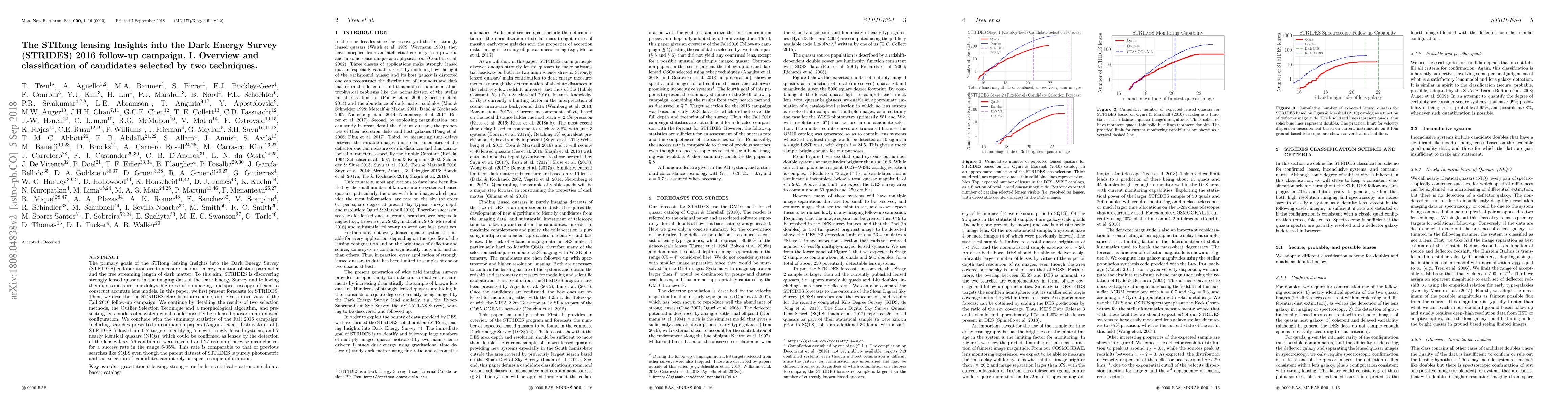 The STRIDES collaboration aims to measure dark energy and dark matter properties by identifying strongly lensed quasars from Dark Energy Survey data. The paper details the follow-up campaign's classification scheme, results from two selection techniques, and presents a new lensed quasar candidate, concluding with a success rate of 6-35% for the Fall 2016 campaign.