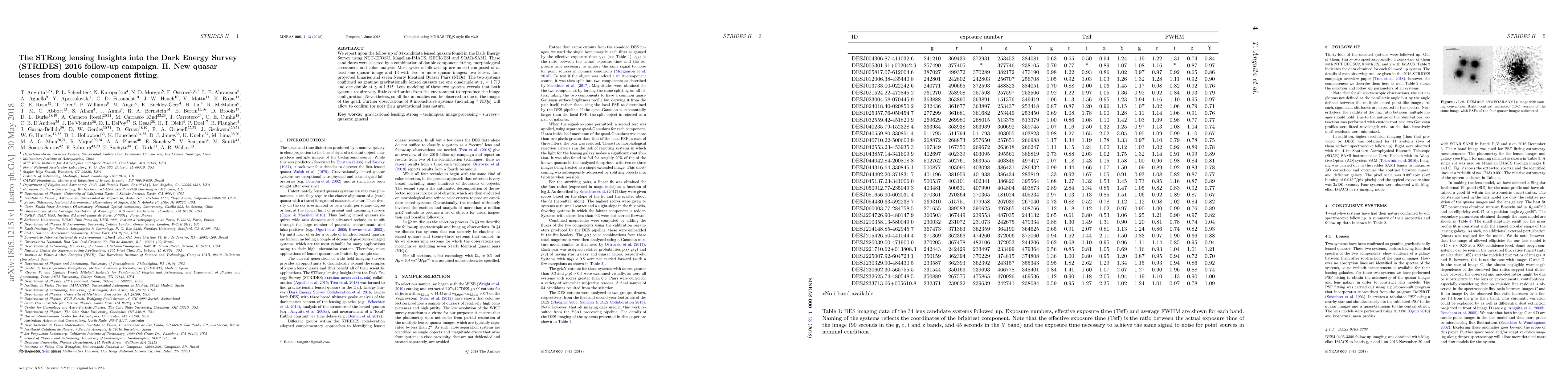 The STRIDES 2016 follow-up campaign identified 34 candidate lensed quasars from the Dark Energy Survey, confirming two genuine gravitationally lensed systems through detailed observations. Lens modeling indicates minimal environmental influence in these systems, with further observations planned to determine the lensing nature of 9 inconclusive candidates.