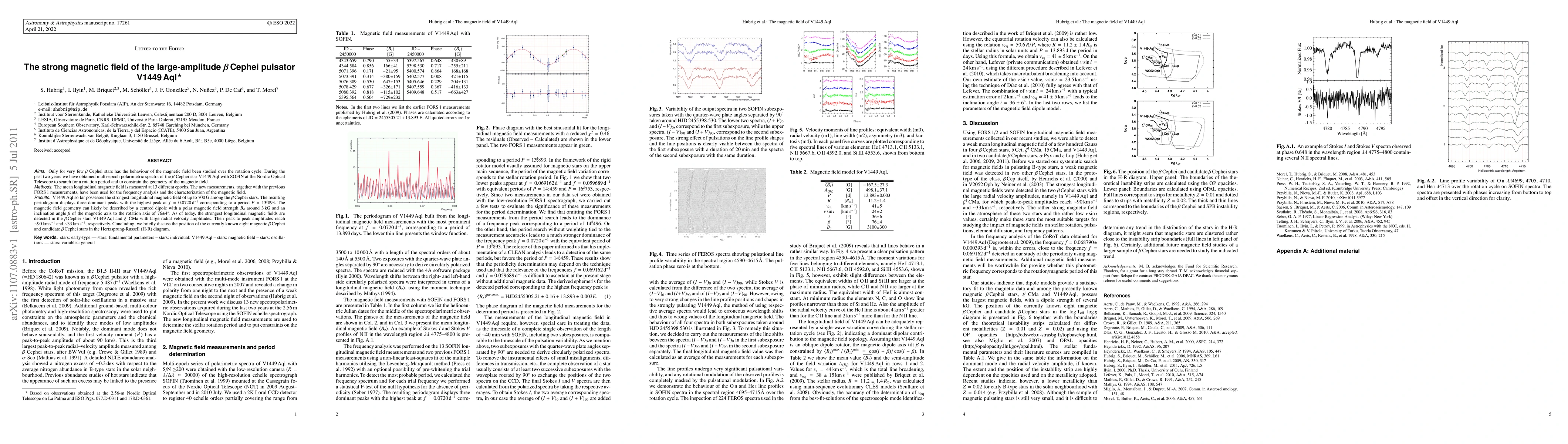 This study investigates the magnetic field behavior of the beta Cephei star V1449 Aql, revealing it possesses the strongest longitudinal magnetic field among such stars, up to 700G. The analysis suggests a centered dipole magnetic field geometry with a polar strength of ~3kG.