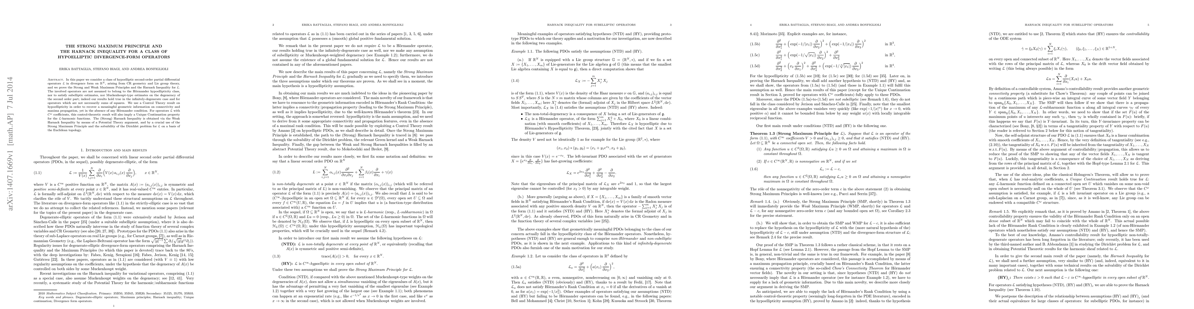 This paper proves the Strong and Weak Maximum Principles and the Harnack Inequality for a class of hypoelliptic divergence-form operators not fitting H\"ormander's hypoellipticity, using a Control Theory result to recover geometric information and connectivity, and establishing a Unique Continuation property for $\mathcal{L}$-harmonic functions.