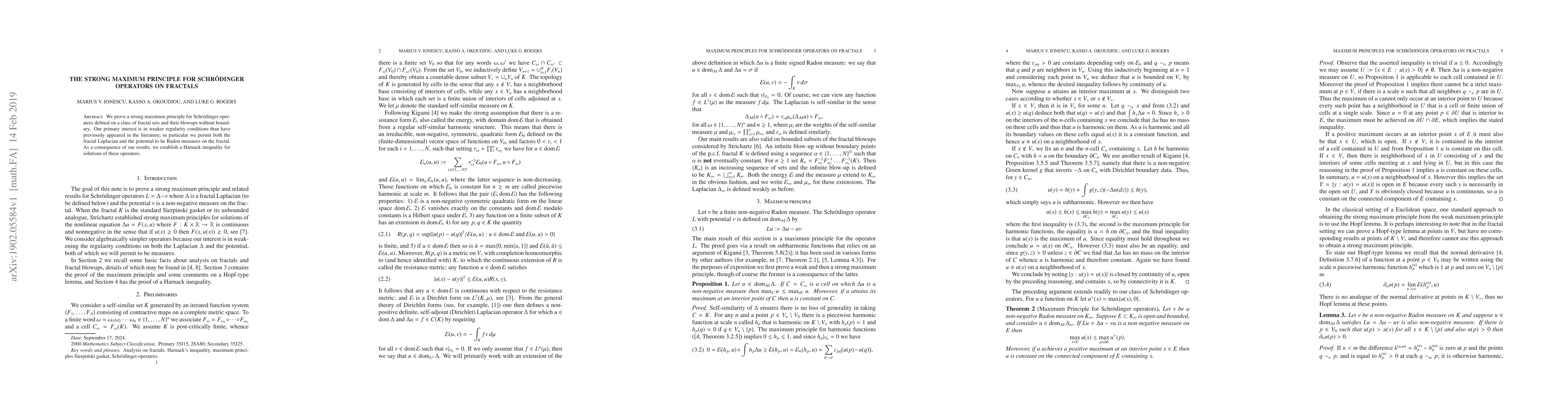 We prove a strong maximum principle for Schr\"odinger operators defined on a class of fractal sets and their blowups without boundary. Our primary interest is in weaker regularity conditions than have previously appeared in the literature; in particular we permit both the fractal Laplacian and the potential to be Radon measures on the fractal. As a consequence of our results, we establish a Harnack inequality for solutions of these operators.