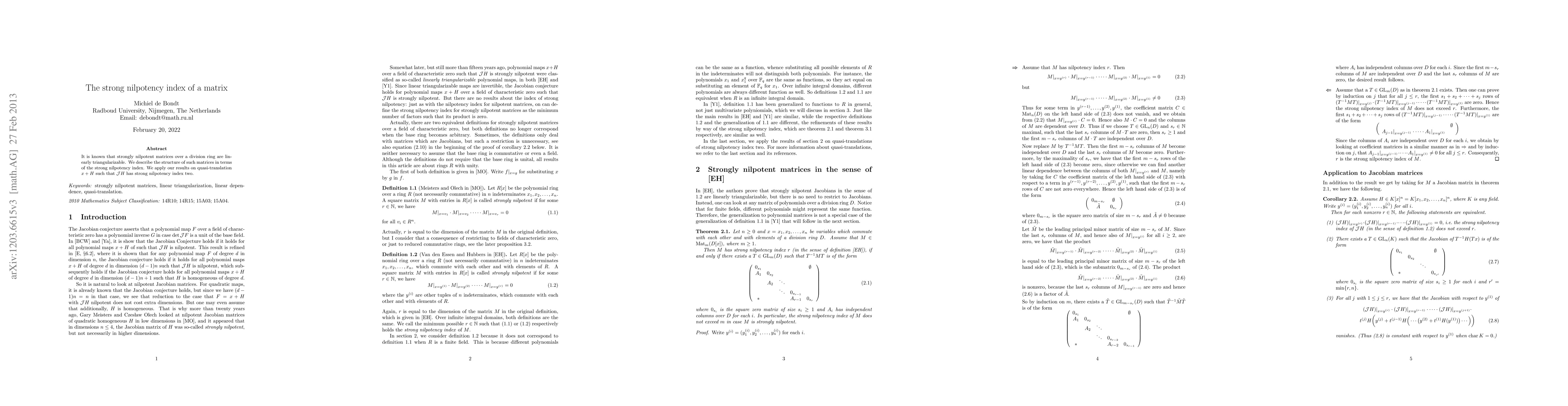 It is known that strongly nilpotent matrices over a division ring are linearly triangularizable. We describe the structure of such matrices in terms of the strong nilpotency index. We apply our results on quasi-translation x + H such that JH has strong nilpotency index two.