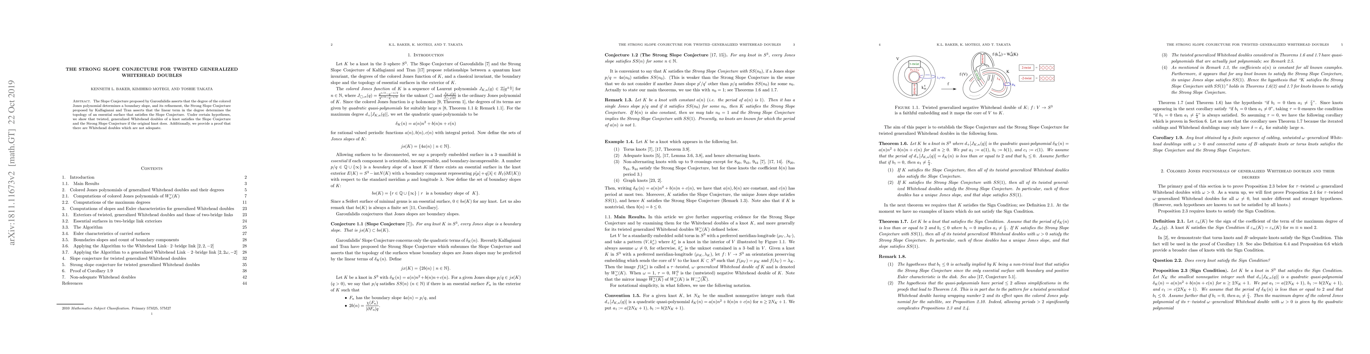 This paper demonstrates that twisted generalized Whitehead doubles of a knot meet both the Slope Conjecture and the Strong Slope Conjecture if the original knot does. It also proves that some Whitehead doubles are not adequate.
