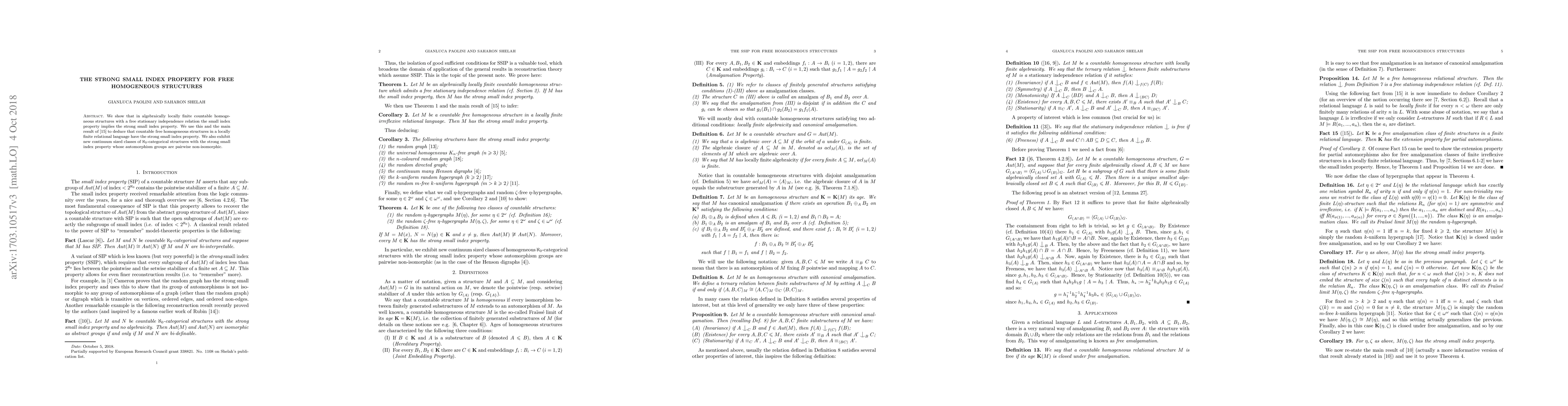 This paper demonstrates that the strong small index property holds for algebraically locally finite countable homogeneous structures with a free stationary independence relation, extending this result to all countable free homogeneous structures in a locally finite relational language. Additionally, it presents new continuum-sized classes of $\aleph_0$-categorical structures with pairwise non-isomorphic automorphism groups, all possessing the strong small index property.