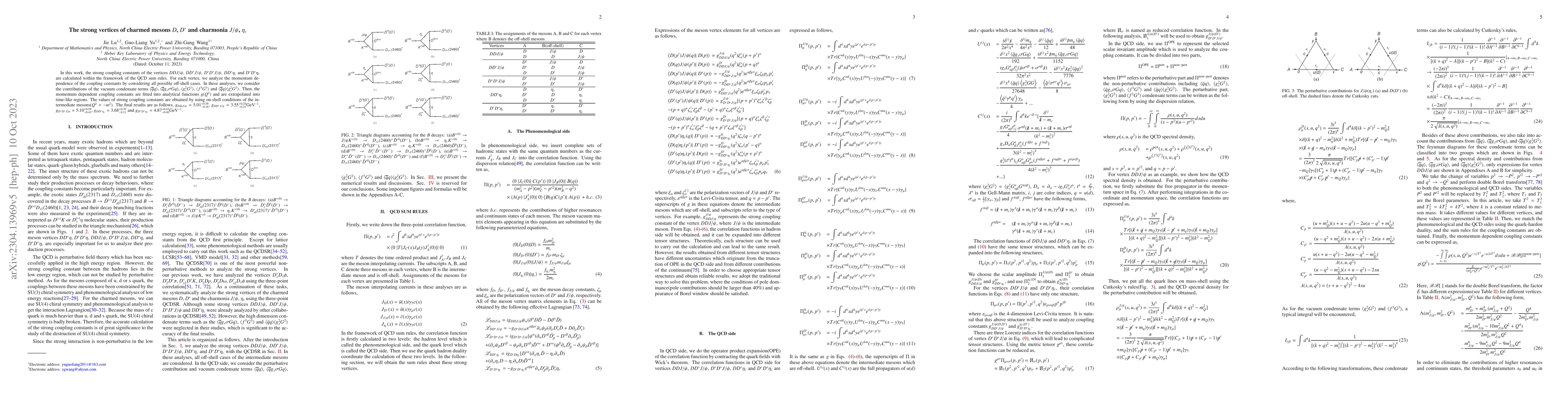 This research calculates the strong coupling constants for various charmed meson and charmonia vertices using QCD sum rules, analyzing the momentum dependence and fitting the results into analytical functions. The obtained values are $g_{DDJ/\psi}=5.01^{+0.58}_{-0.16}$, $g_{DD^{*}J/\psi}=3.55^{+0.20}_{-0.21}$GeV$^{-1}$, $g_{D^{*}D^{*}J/\psi}=5.10^{+0.59}_{-0.43}$, $g_{DD^{*}\eta_{c}}=3.68^{+0.39}_{-0.11}$, and $g_{D^{*}D^{*}\eta_{c}}=4.87^{+0.42}_{-0.40}$GeV$^{-1}$.