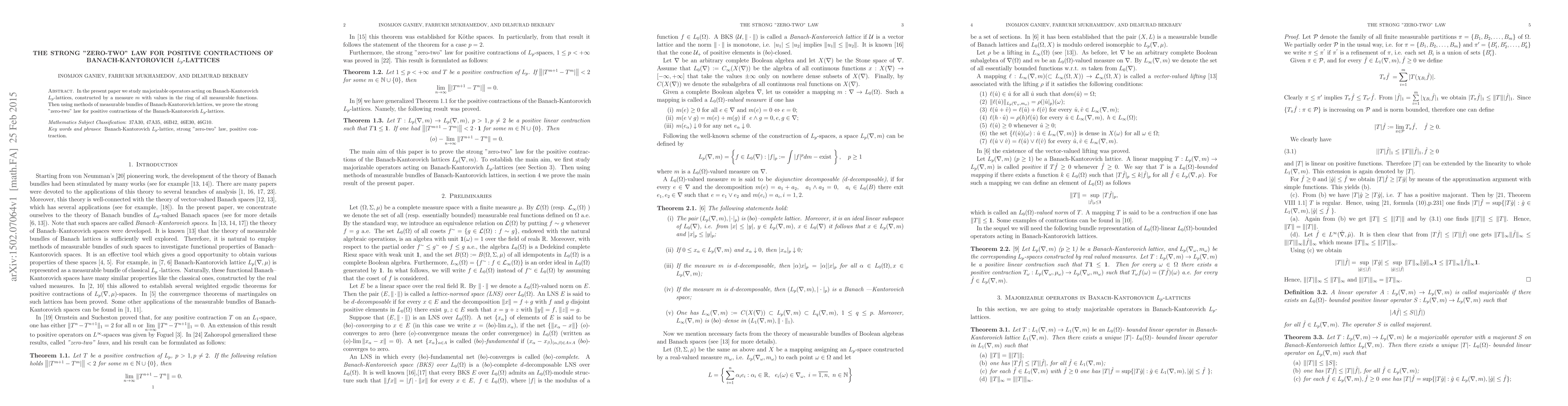 This paper investigates majorizable operators on Banach-Kantorovich $L_p$-lattices, proving the strong "zero-two" law for positive contractions using measurable bundle methods. The study focuses on lattices constructed via a measure with measurable function values.