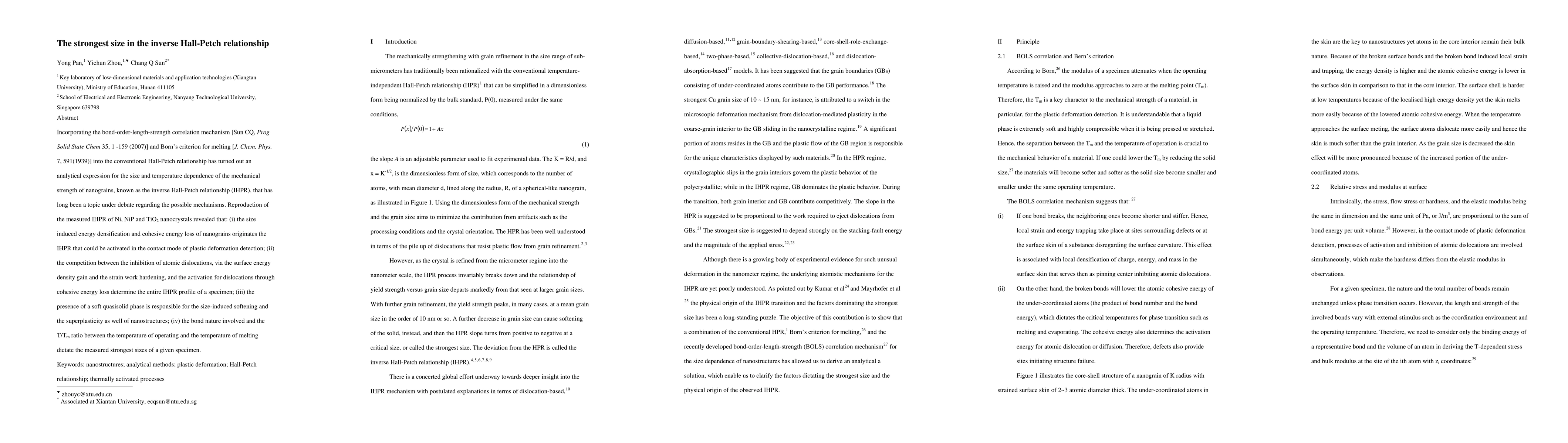 This paper develops an analytical expression for the inverse Hall-Petch relationship (IHPR) by incorporating bond-order mechanisms and Born's criterion, revealing that the strongest sizes in nanograins are dictated by the competition between dislocation inhibition and energy loss, influenced by temperature and bond nature.