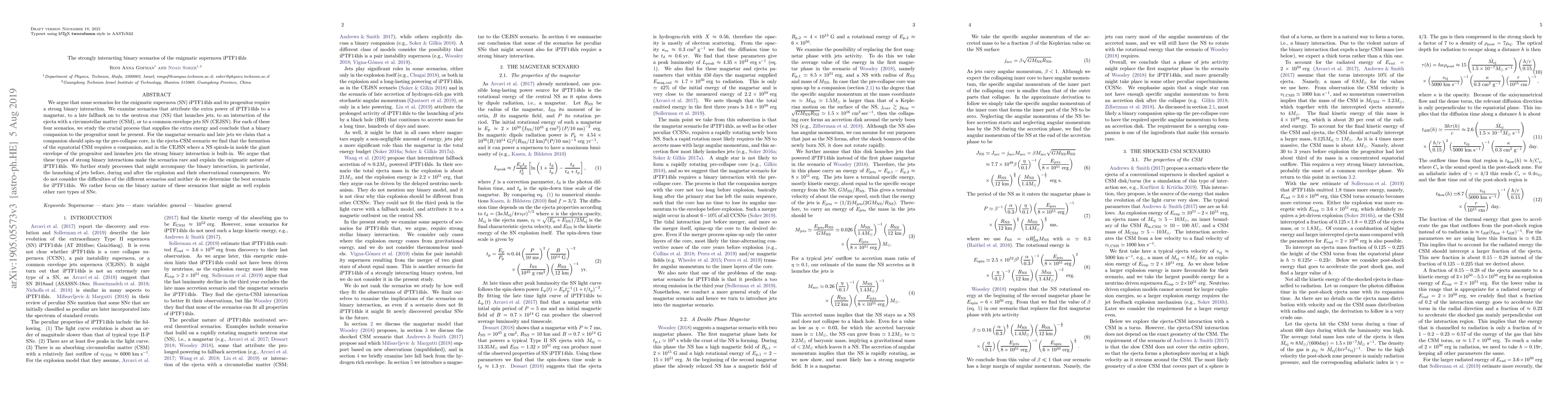 We argue that some scenarios for the enigmatic supernova (SN) iPTF14hls and its progenitor require a strong binary interaction. We examine scenarios that attribute the extra power of iPTF14hls to a magnetar, to a late fallback on to the neutron star (NS) that launches jets, to an interaction of the ejecta with a circumstellar matter (CSM), or to a common envelope jets SN (CEJSN). For each of these four scenarios, we study the crucial process that supplies the extra energy and conclude that a binary companion to the progenitor must be present. For the magnetar scenario and late jets we claim that a companion should spin-up the pre-collapse core, in the ejecta-CSM scenario we find that the formation of the equatorial CSM requires a companion, and in the CEJSN where a NS spirals-in inside the giant envelope of the progenitor and launches jets the strong binary interaction is built-in. We argue that these types of strong binary interactions make the scenarios rare and explain the enigmatic nature of iPTF14hls. We further study processes that might accompany the binary interaction, in particular, the launching of jets before, during and after the explosion and their observational consequences. We do not consider the difficulties of the different scenarios and neither do we determine the best scenario for iPTF14hls. We rather focus on the binary nature of these scenarios that might as well explain other rare types of SNe.