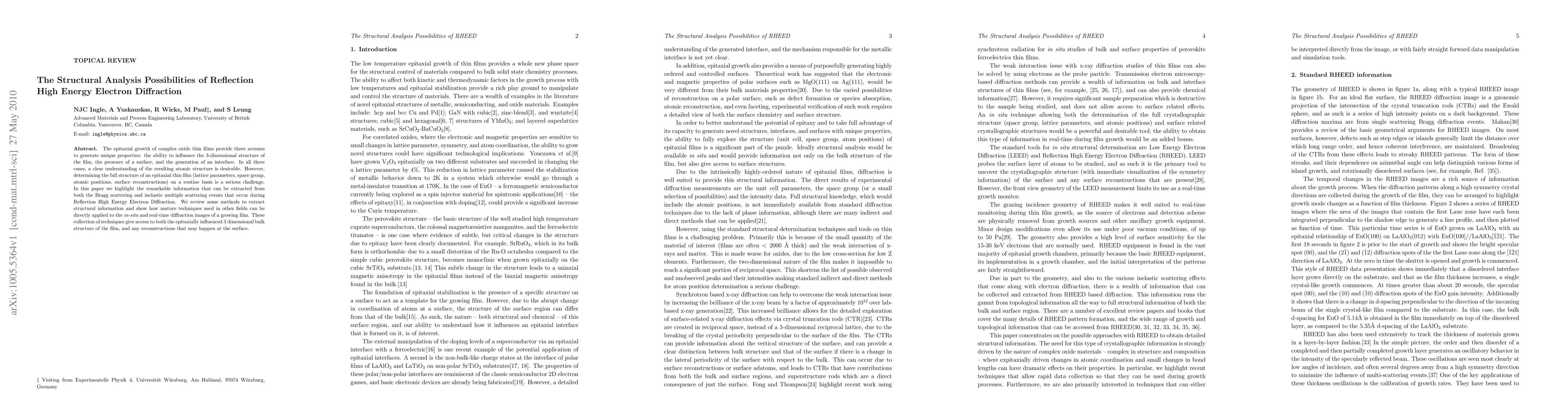 The epitaxial growth of complex oxide thin films provide three avenues to generate unique properties: the ability to influence the 3-dimensional structure of the film, the presence of a surface, and the generation of an interface. In all three cases, a clear understanding of the resulting atomic structure is desirable. However, determining the full structure of an epitaxial thin film (lattice parameters, space group, atomic positions, surface reconstructions) on a routine basis is a serious challenge. In this paper we highlight the remarkable information that can be extracted from both the Bragg scattering and inelastic multiple scattering events that occur during Reflection High Energy Electron Diffraction. We review some methods to extract structural information and show how mature techniques used in other fields can be directly applied to the {\em in-situ} and real-time diffraction images of a growing film. These collection of techniques give access to both the epitaxially influenced 3 dimensional bulk structure of the film, and any reconstructions that may happen at the surface.