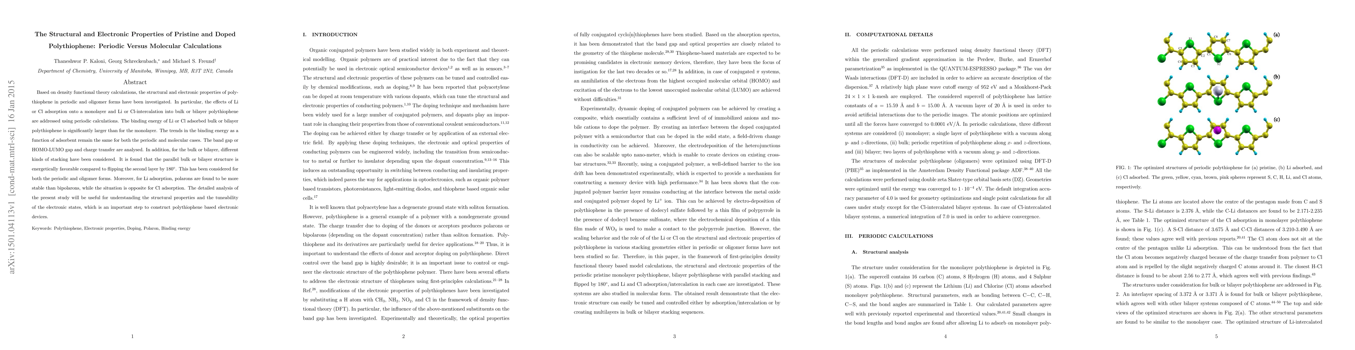 This paper investigates the structural and electronic properties of pristine and doped polythiophene using density functional theory, comparing periodic and molecular calculations. It finds that Li or Cl adsorption and intercalation into bulk polythiophene have significantly higher binding energies than monolayers, with parallel stacking being energetically favorable.