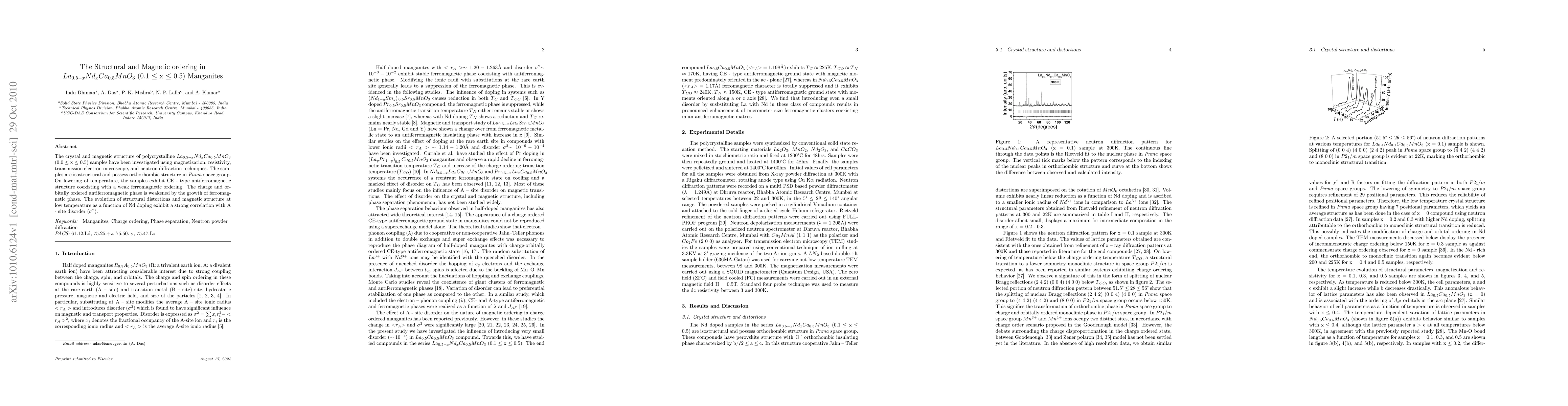 This study investigates the structural and magnetic properties of $La{}_{0.5-x}Nd_{x}Ca_{0.5}MnO_{3}$ manganites, revealing an orthorhombic structure and coexistence of CE-type antiferromagnetic and weak ferromagnetic orderings. The research shows a strong correlation between A-site disorder and the evolution of structural and magnetic properties with Nd doping.