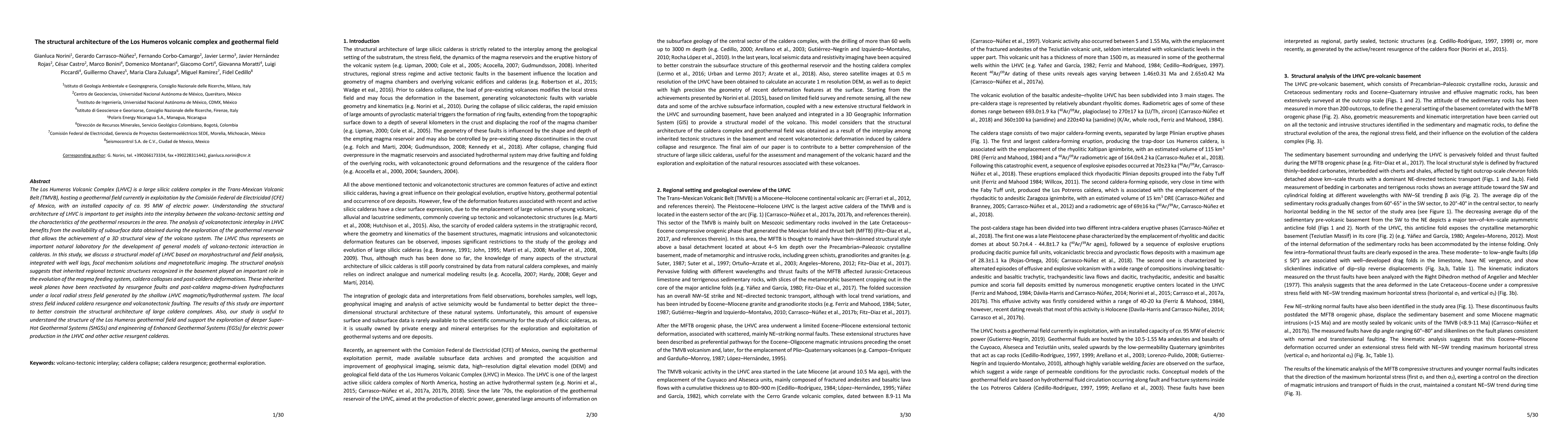 The Los Humeros Volcanic Complex, a large silicic caldera in Mexico, hosts a geothermal field exploited for electricity, with insights into its structural architecture aiding in understanding volcano-tectonic interactions and geothermal resource characteristics. Subsurface data from geothermal exploration provides a 3D view, making it a key site for studying caldera volcano-tectonic dynamics.
