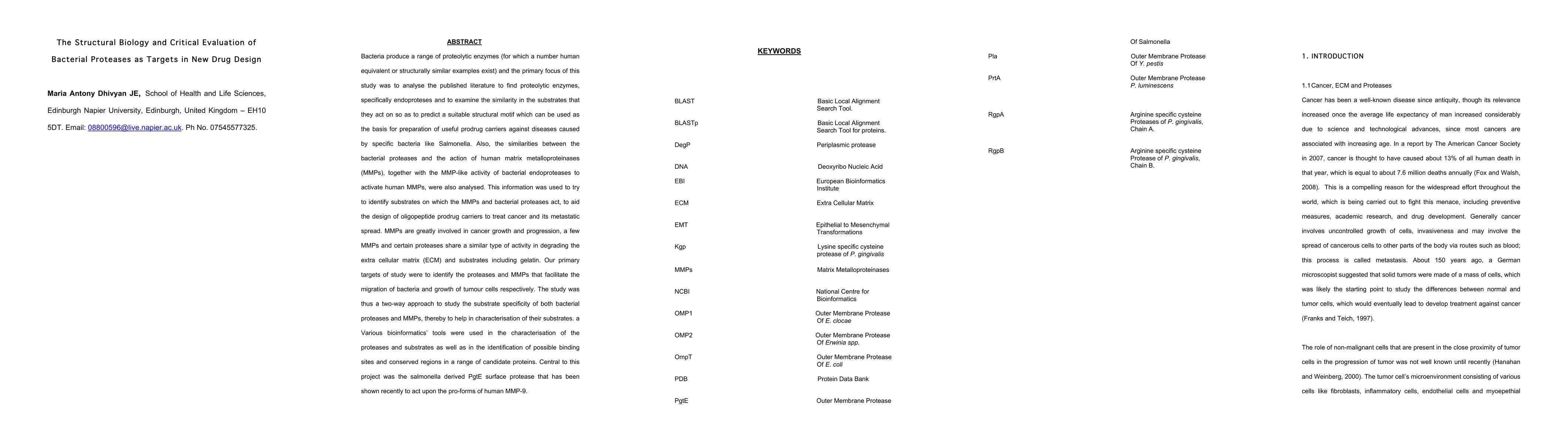 Bacteria produce a range of proteolytic enzymes, for which a number human equivalent or structurally similar examples exist and the primary focus of this study was to analyse the published literature to find proteolytic enzymes, specifically endoproteses and to examine the similarity in the substrates that they act on so as to predict a suitable structural motif which can be used as the basis for preparation of useful prodrug carriers against diseases caused by specific bacteria like Salmonella. Also, the similarities between the bacterial proteases and the action of human matrix metalloproteinases (MMPs), together with the MMP-like activity of bacterial endoproteases to activate human MMPs, were also analysed. This information was used to try to identify substrates on which the MMPs and bacterial proteases act, to aid the design of oligopeptide prodrug carriers to treat cancer and its metastatic spread. MMPs are greatly involved in cancer growth and progression, a few MMPs and certain proteases share a similar type of activity in degrading the extra cellular matrix (ECM) and substrates including gelatin. Our primary targets of study were to identify the proteases and MMPs that facilitate the migration of bacteria and growth of tumour cells respectively. The study was thus a two-way approach to study the substrate specificity of both bacterial proteases and MMPs, thereby to help in characterisation of their substrates. Various bioinformatics tools were used in the characterisation of the proteases and substrates as well as in the identification of possible binding sites and conserved regions in a range of candidate proteins. Central to this project was the salmonella derived PgtE surface protease that has been shown recently to act upon the pro-forms of human MMP-9.