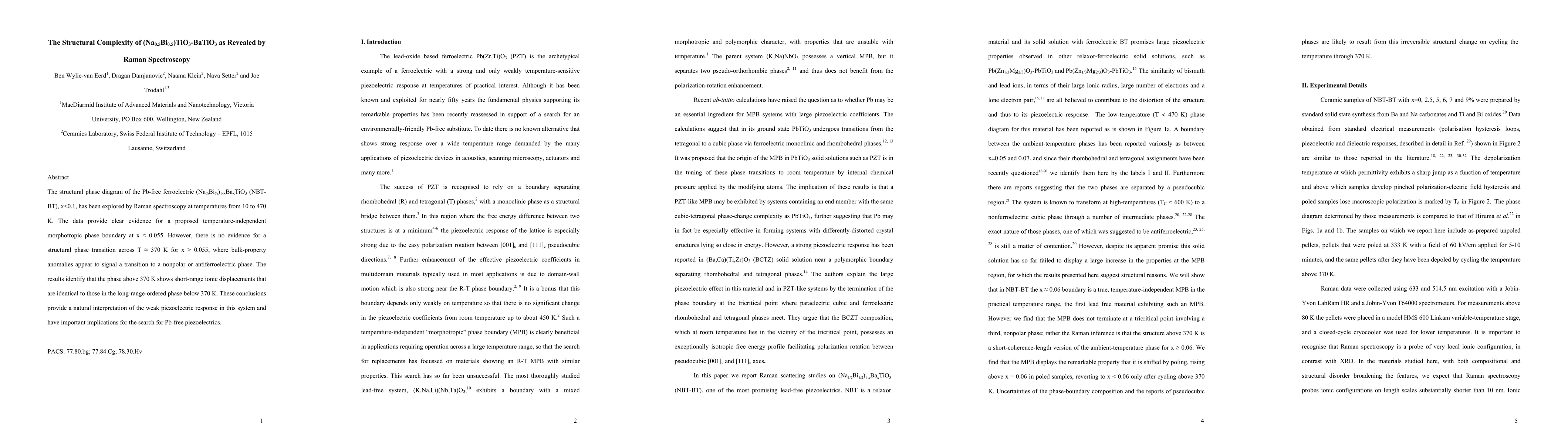 The paper presents a detailed Raman spectroscopy analysis of NBT-BT, revealing the absence of a structural phase transition across T ≈ 370 K and identifying short-range ionic displacements above this temperature.