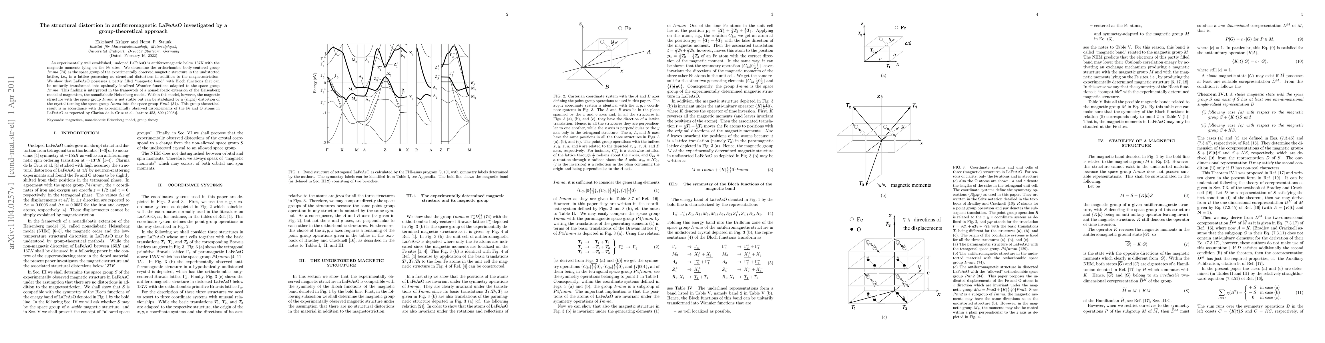 As experimentally well established, undoped LaFeAsO is antiferromagnetic below 137K with the magnetic moments lying on the Fe sites. We determine the orthorhombic body-centered group Imma (74) as the space group of the experimentally observed magnetic structure in the undistorted lattice, i.e., in a lattice possessing no structural distortions in addition to the magnetostriction. We show that LaFeAsO possesses a partly filled "magnetic band" with Bloch functions that can be unitarily transformed into optimally localized Wannier functions adapted to the space group Imma. This finding is interpreted in the framework of a nonadiabatic extension of the Heisenberg model of magnetism, the nonadiabatic Heisenberg model. Within this model, however, the magnetic structure with the space group Imma is not stable but can be stabilized by a (slight) distortion of the crystal turning the space group Imma into the space group Pnn2 (34). This group-theoretical result is in accordance with the experimentally observed displacements of the Fe and O atoms in LaFeAsO as reported by Clarina de la Cruz et al. [nature 453, 899 (2008)].
