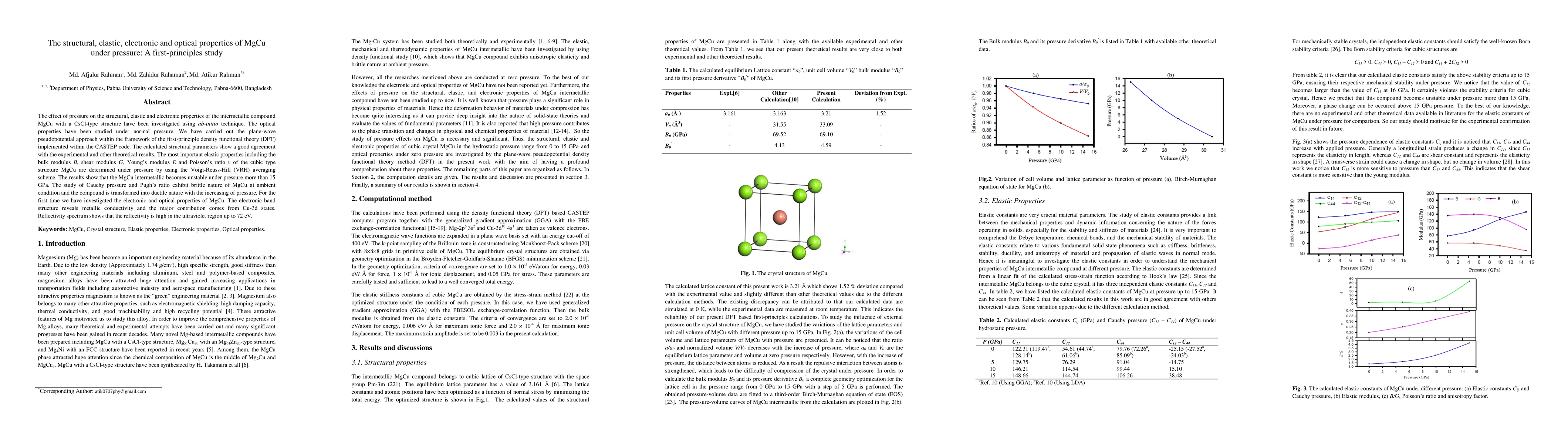 Summary: This study investigates the structural, elastic, electronic, and optical properties of MgCu under pressure using first-principles density functional theory (DFT) calculations. The findings align well with existing experimental and theoretical data, providing insights into MgCu's behavior under different pressures.
