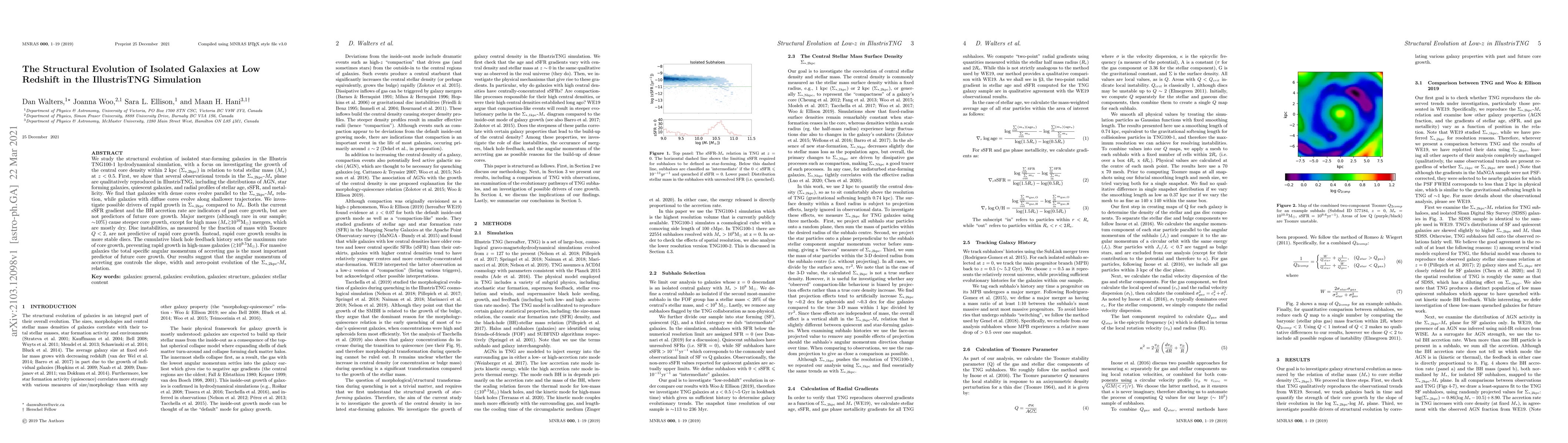 We study the structural evolution of isolated star-forming galaxies in the Illustris TNG100-1 hydrodynamical simulation, with a focus on investigating the growth of the central core density within 2 kpc ($\Sigma_{*,2kpc}$) in relation to total stellar mass ($M_*$) at z < 0.5. First, we show that several observational trends in the $\Sigma_{*,2kpc}$-$M_*$ plane are qualitatively reproduced in IllustrisTNG, including the distributions of AGN, star forming galaxies, quiescent galaxies, and radial profiles of stellar age, sSFR, and metallicity. We find that galaxies with dense cores evolve parallel to the $\Sigma_{*,2kpc}$-$M_*$ relation, while galaxies with diffuse cores evolve along shallower trajectories. We investigate possible drivers of rapid growth in $\Sigma_{*,2kpc}$ compared to $M_*$. Both the current sSFR gradient and the BH accretion rate are indicators of past core growth, but are not predictors of future core growth. Major mergers (although rare in our sample; $\sim$10%) cause steeper core growth, except for high mass ($M_*$ >$\sim$ $10^{10} M_{\odot}$) mergers, which are mostly dry. Disc instabilities, as measured by the fraction of mass with Toomre Q < 2, are not predictive of rapid core growth. Instead, rapid core growth results in more stable discs. The cumulative black hole feedback history sets the maximum rate of core growth, preventing rapid growth in high-mass galaxies ($M_*$ >$\sim$ $10^{9.5} M_{\odot}$). For massive galaxies the total specific angular momentum of accreting gas is the most important predictor of future core growth. Our results suggest that the angular momentum of accreting gas controls the slope, width and zero-point evolution of the $\Sigma_{*,2kpc}$-$M_*$ relation.