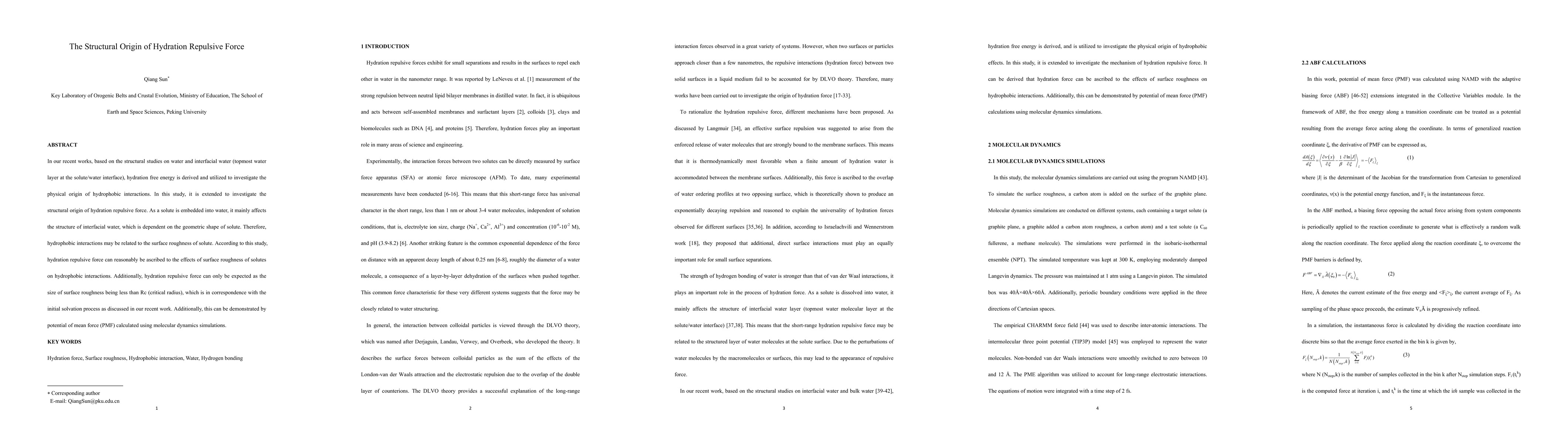 Research finds that hydration repulsive force in water is caused by surface roughness of solutes, with effects only occurring when the roughness is less than a critical radius. This relationship can be demonstrated through molecular dynamics simulations.